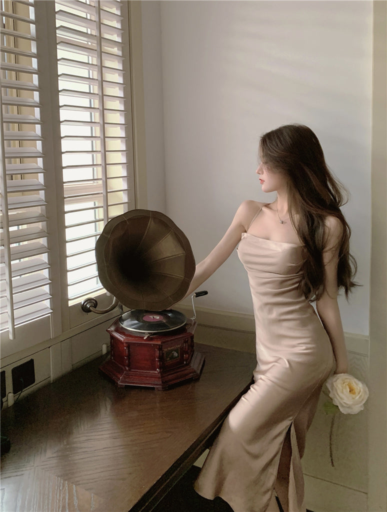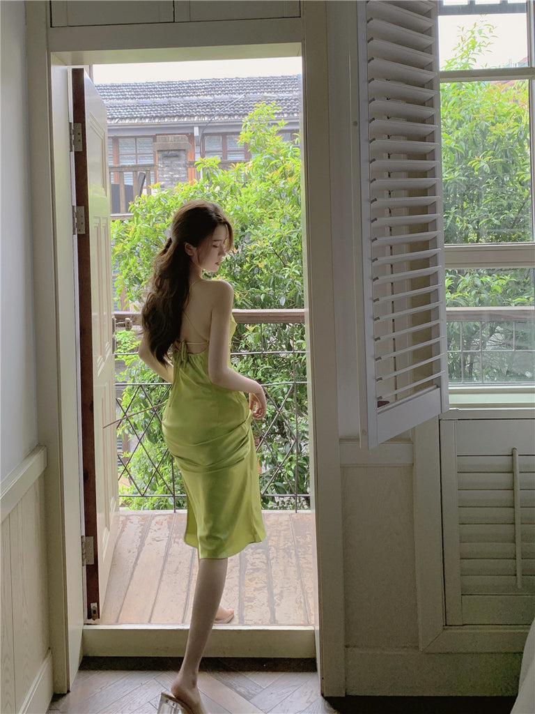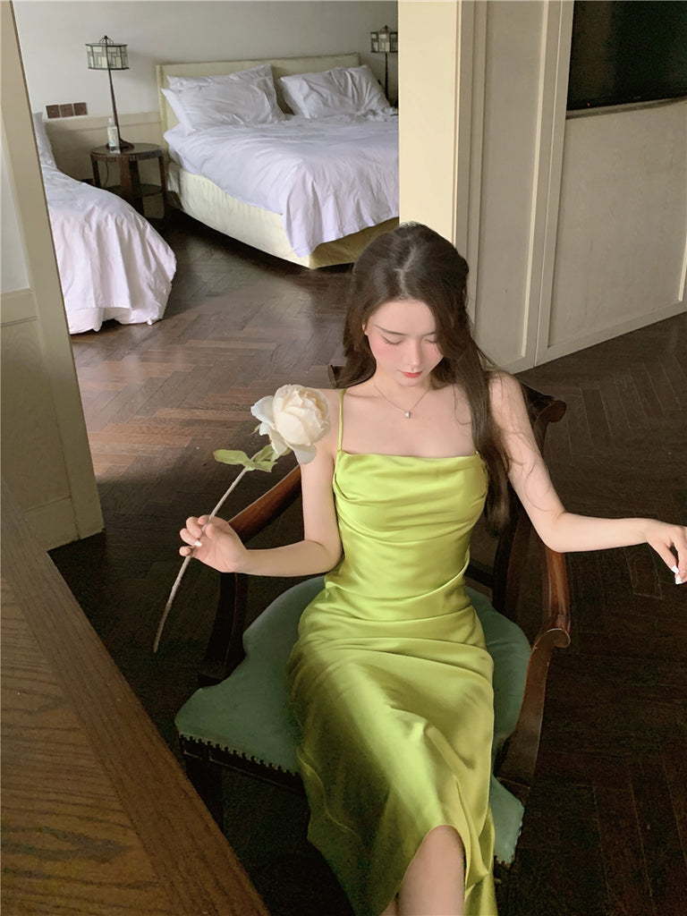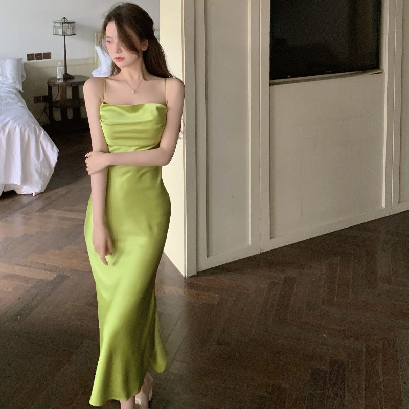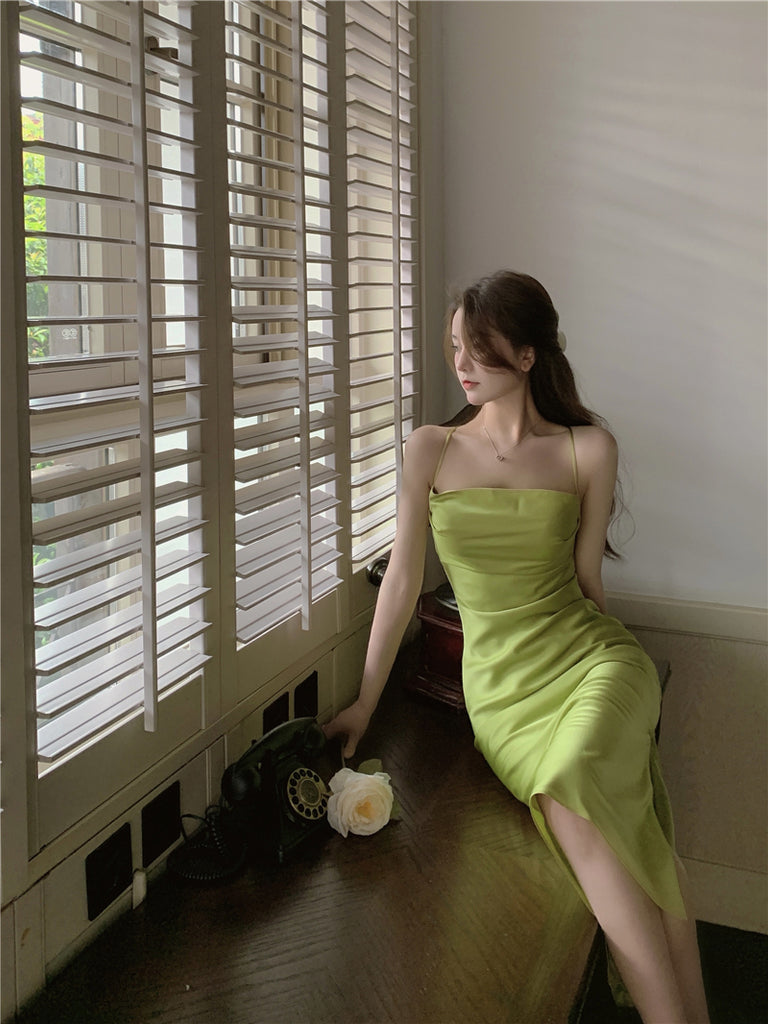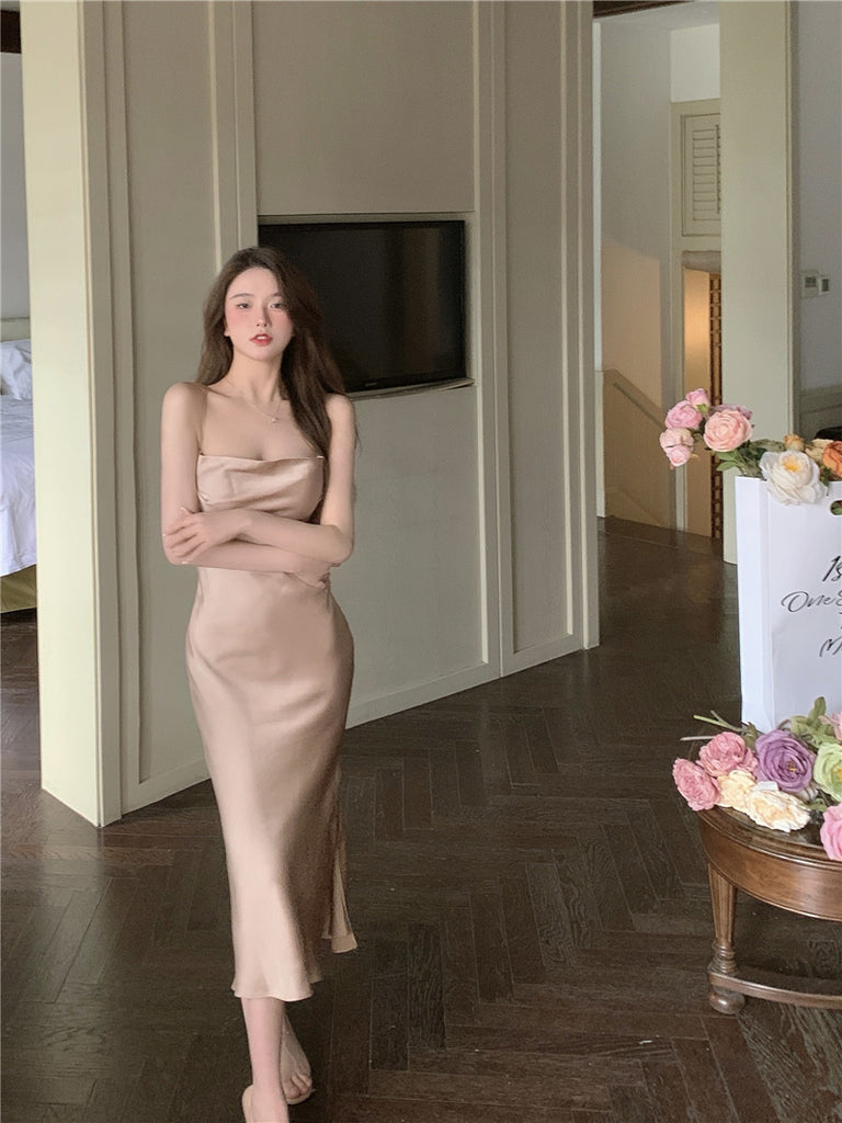 Amazing Sexy Women Back Hollow Backless Solid Color Satin Sleeveless Halter Strap Pencil Side Split Dress