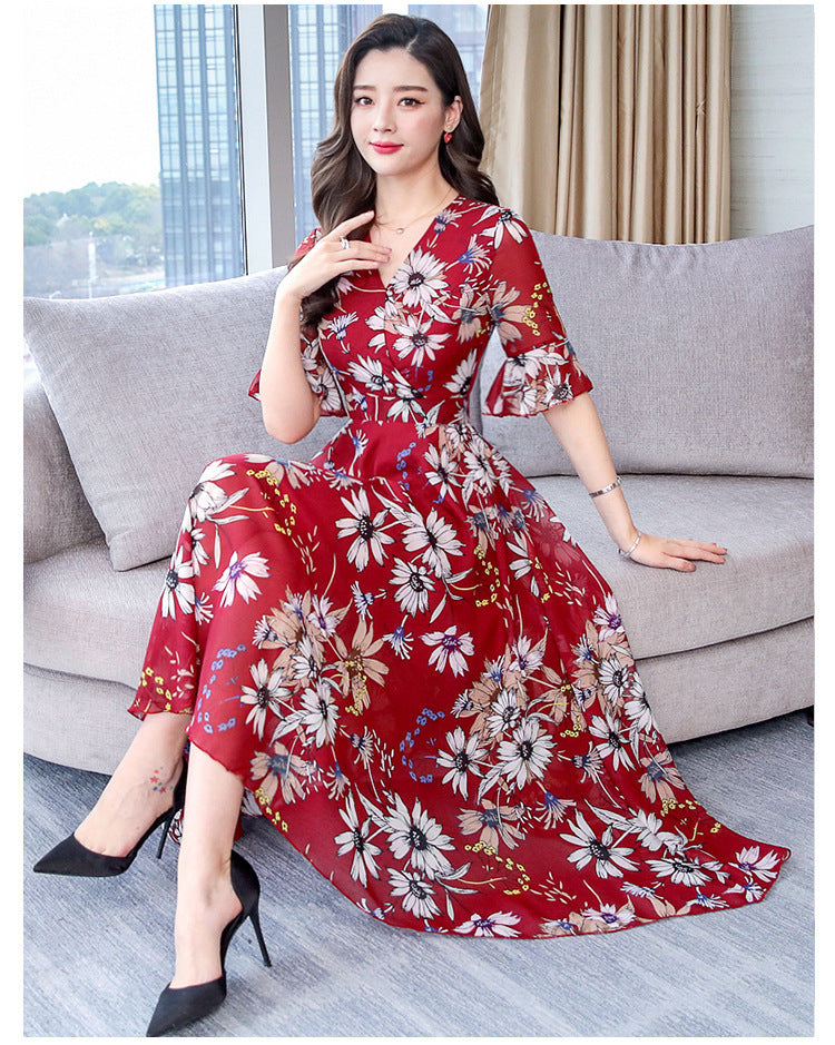 Attractive Chiffon Floral Bohemian Short Sleeved Long Beach A Line Dress