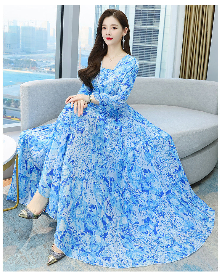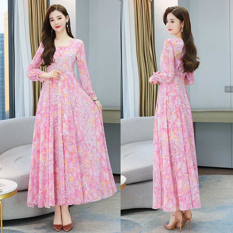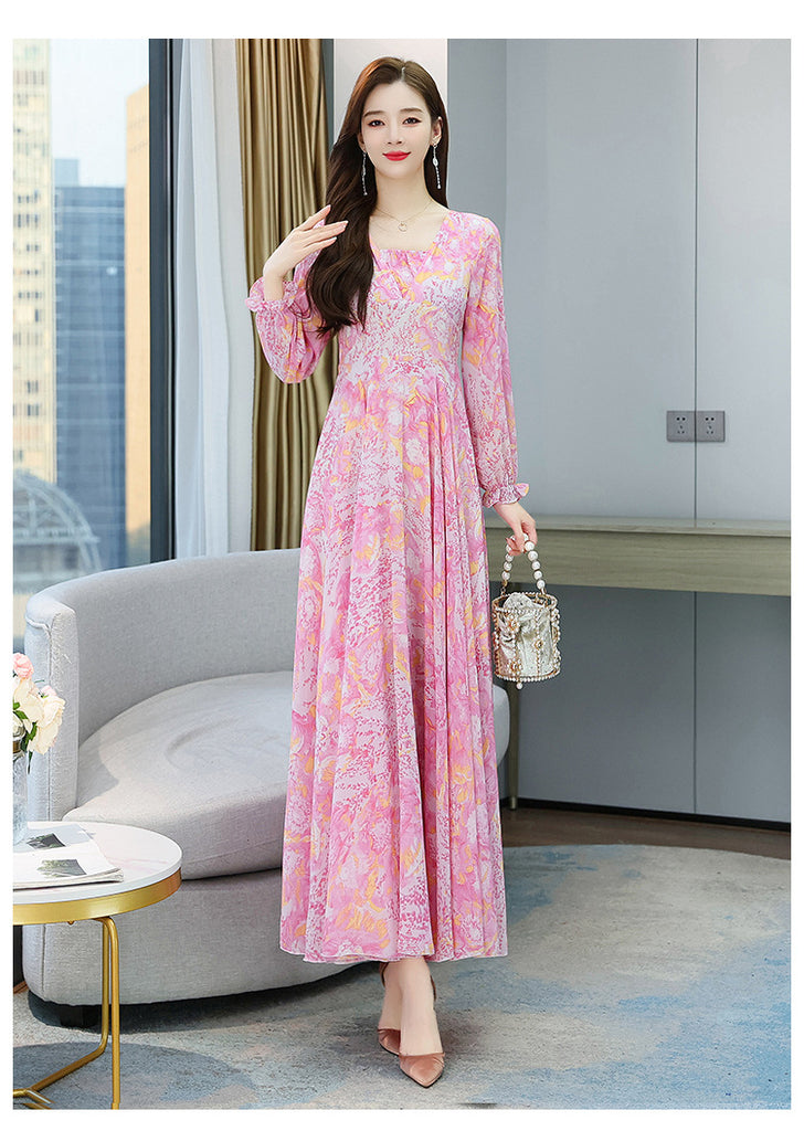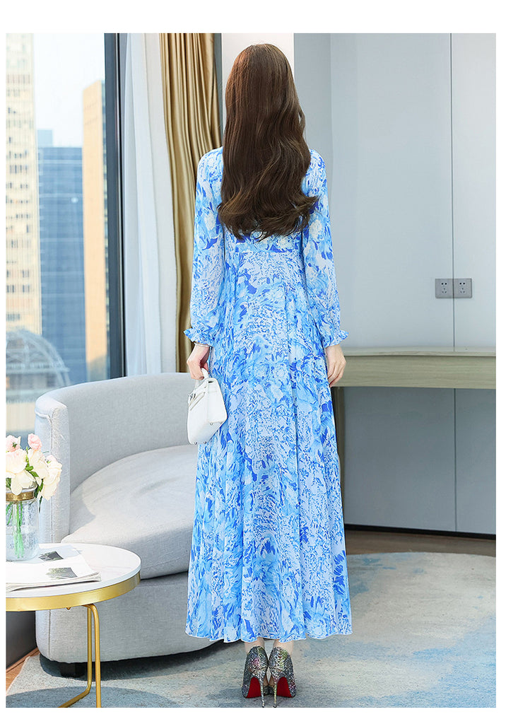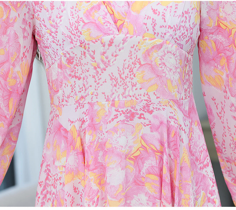 Chic Women Floral Chiffon V-neck Long Sleeved Knee Length Big Swing Dress