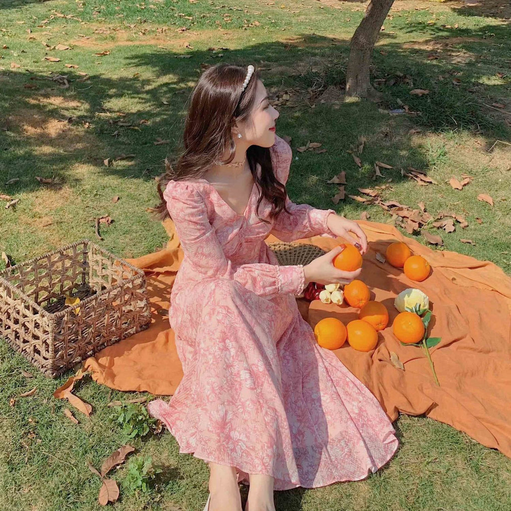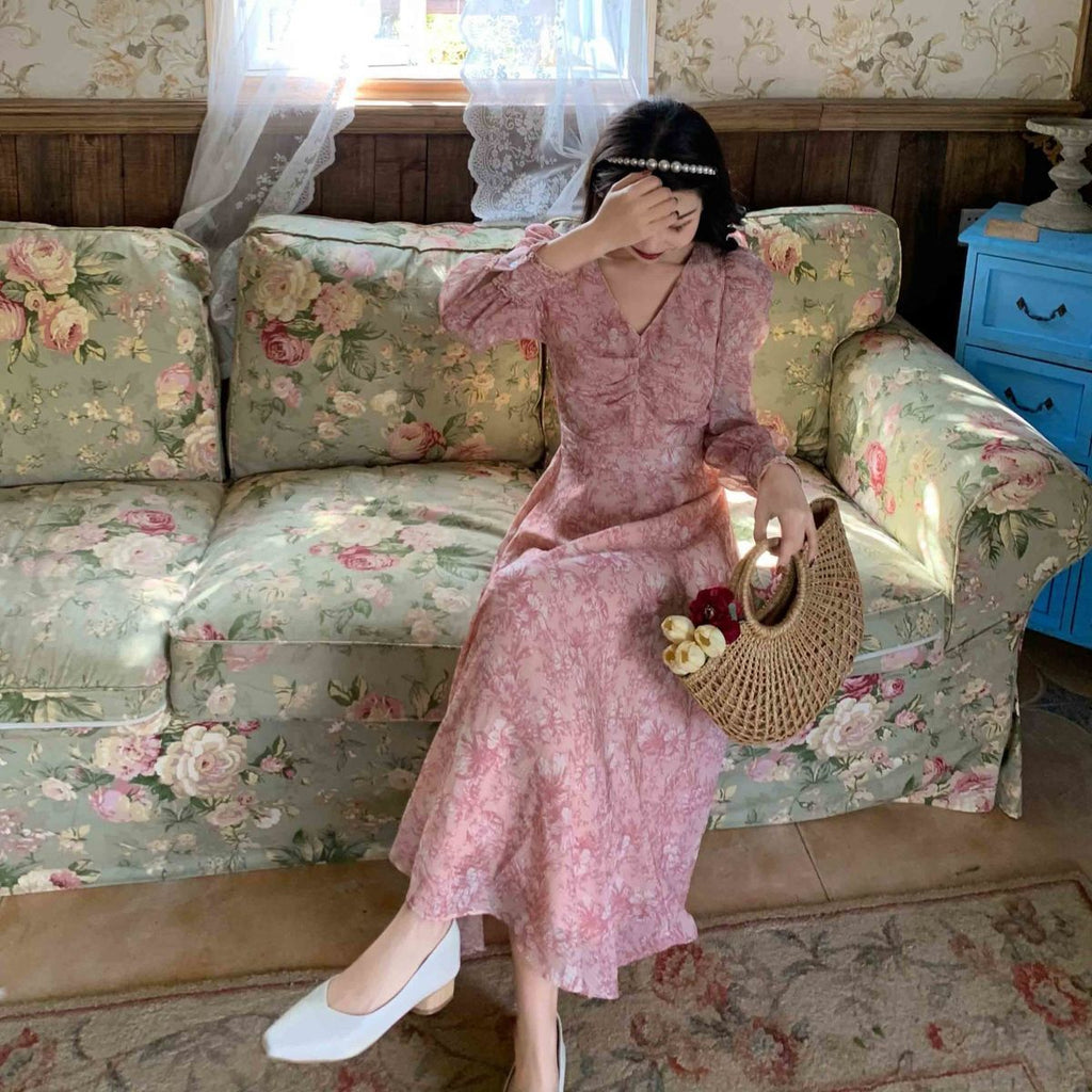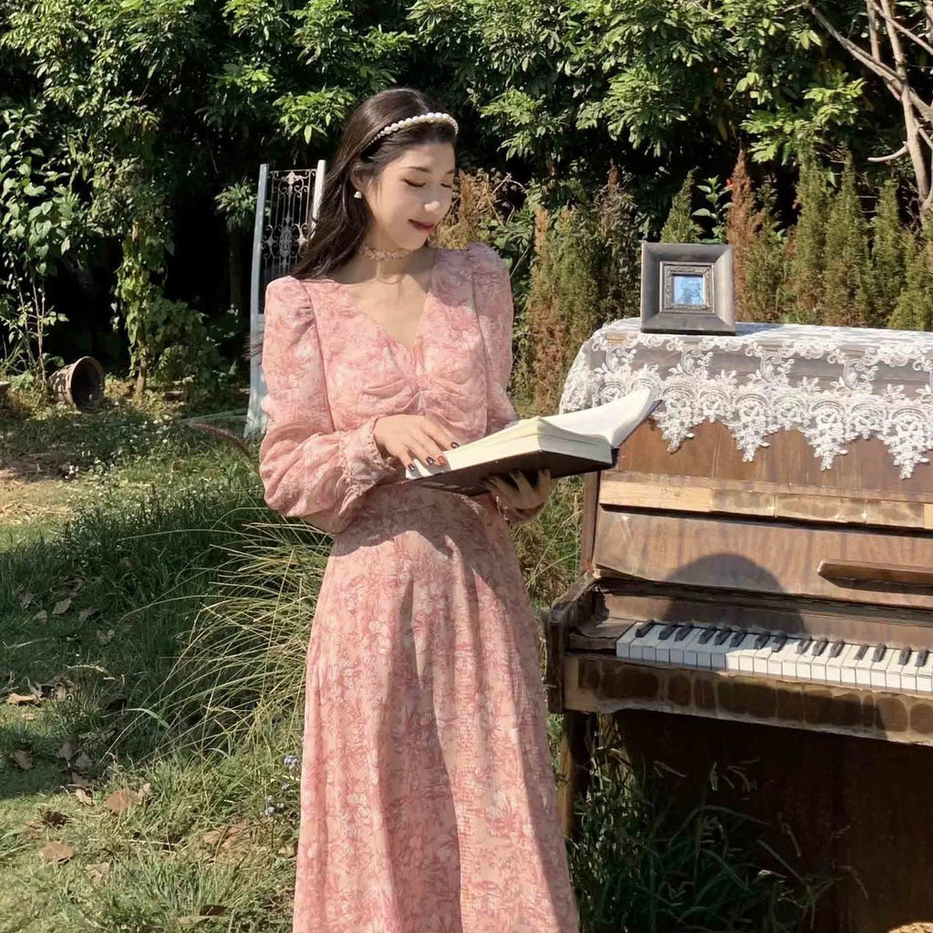 Coffee Tea Break Sweet Bell Flower Loose Waist A-line Long Pink Dress
