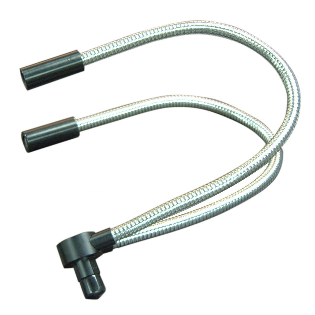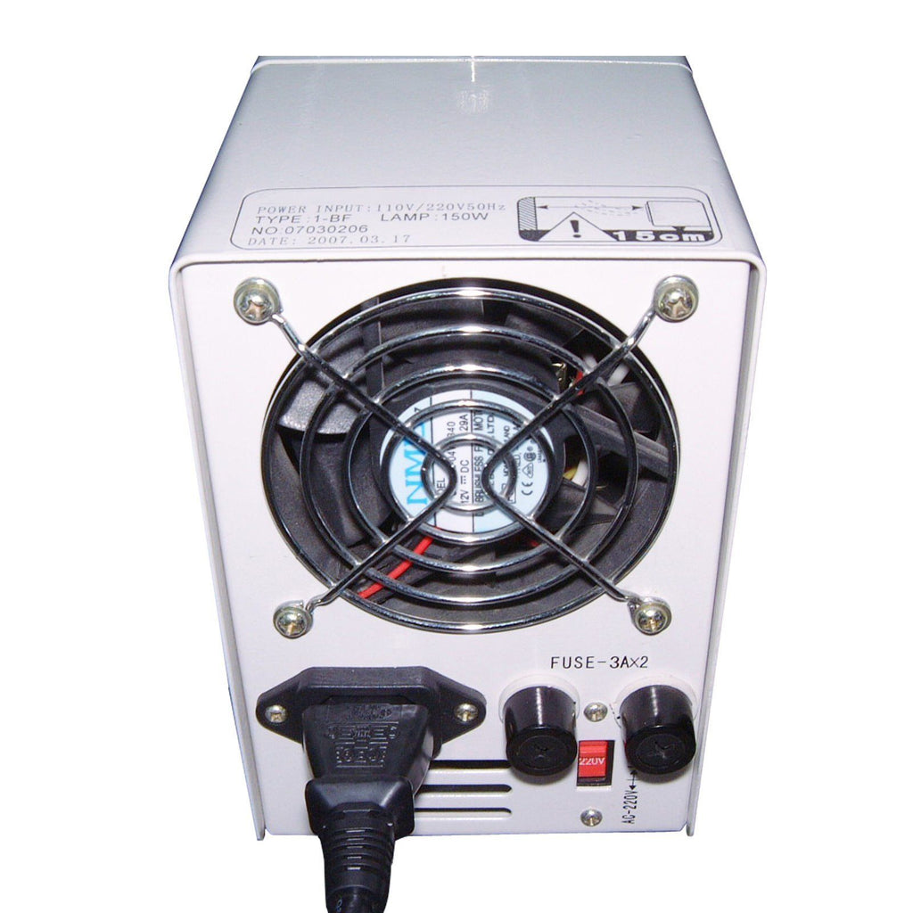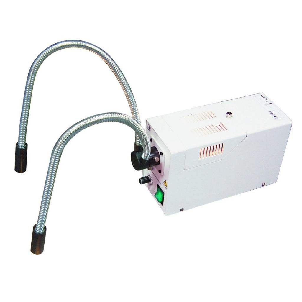 The top-of-the-line quality fiber optic dual light microscope illuminator has a top window design in which changing bulbs is very convenient.  The halogen illuminator is perfect for shadow-free cold illumination in medical applications, industrial assembly, electronics inspection, or microscopy. Each metal-sheathed light cable is 22-inch long and can be bend to any direction for flexible light positioning.