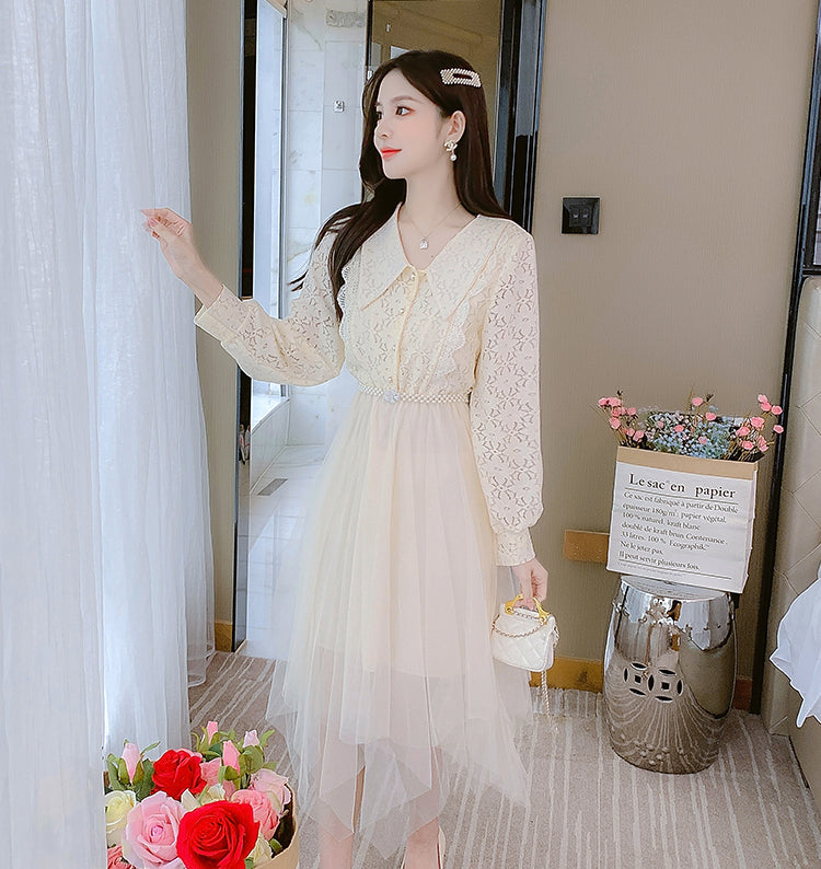 Fairy Sweet Temperament Women Long Sleeves Big Polo Collar Irregular Mesh Hem Stitching Lace Dress