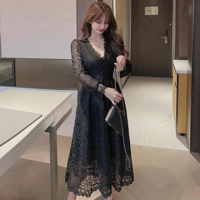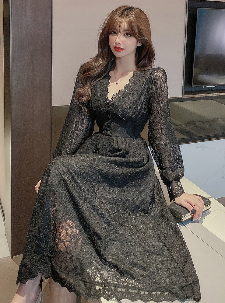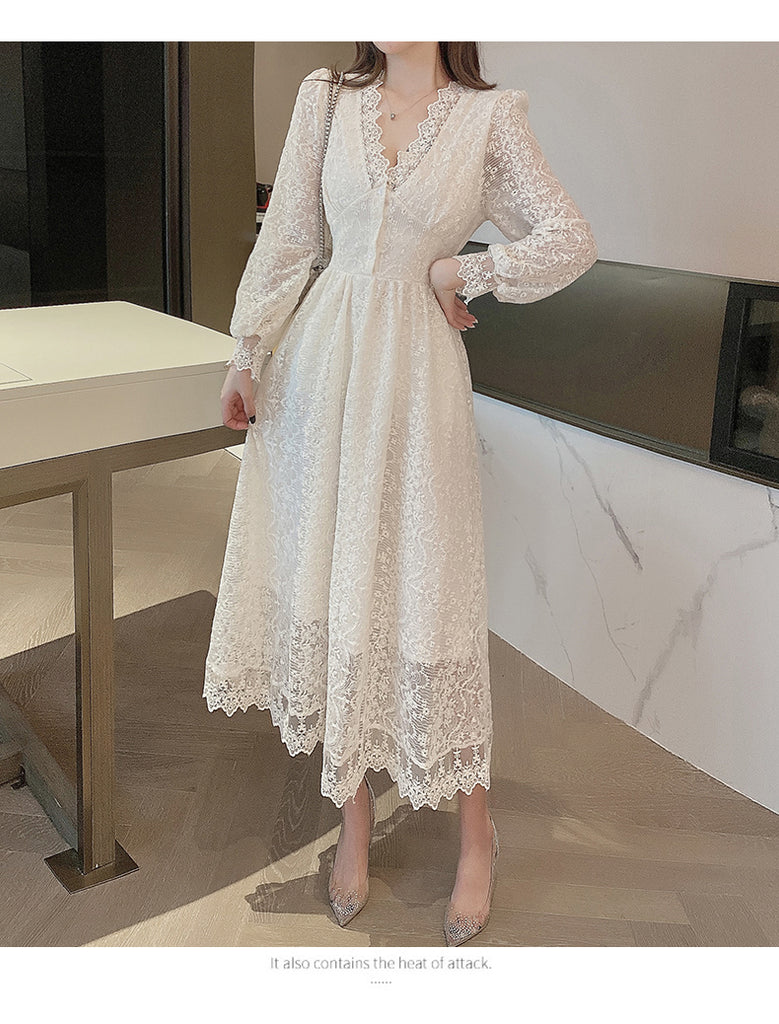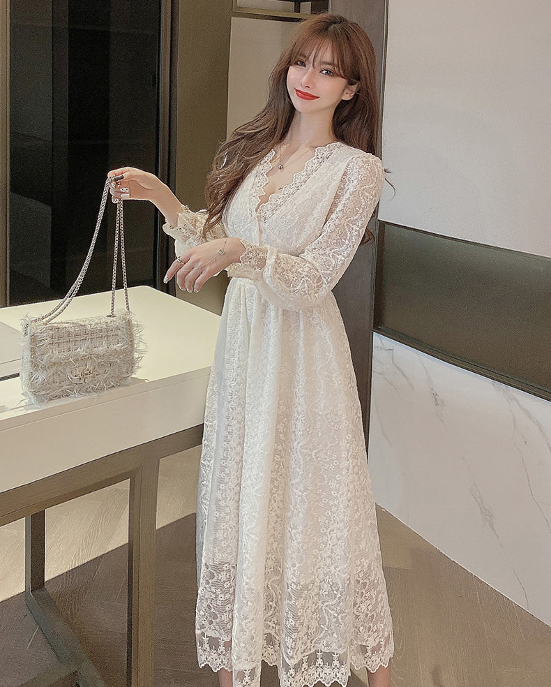 Fairy Temperament Elegant Women Lace Ruffle V Neck Top High Waist Long Sleeved A Line Dress