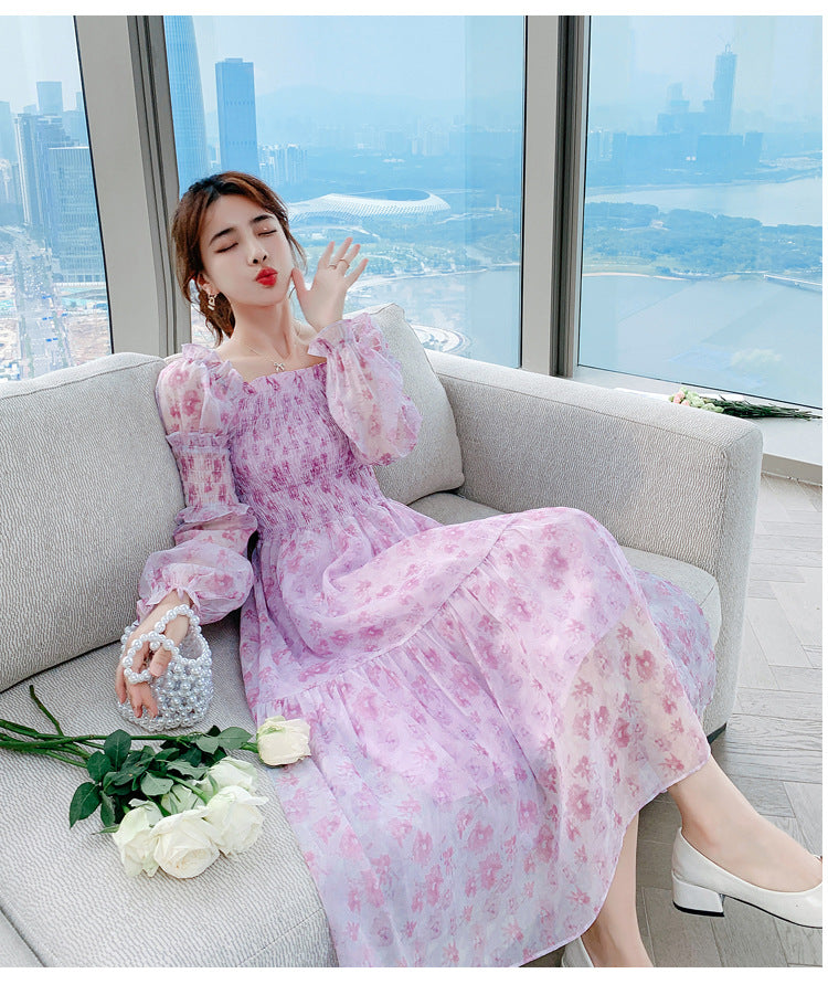 Long Sleeved Temperament Elastics Shoulder Comfortable Skirt Mesh Floral Fairy chiffon Dress