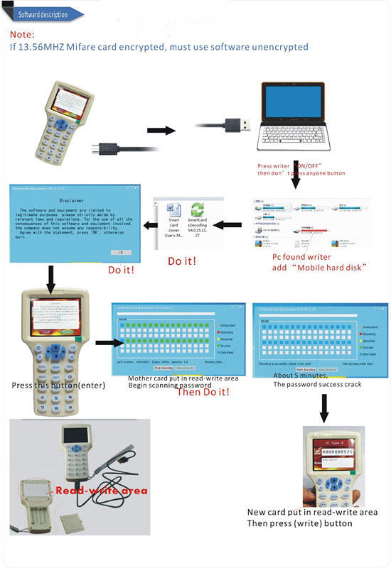 If encrypt Mifare 13.56MHz, must connect computer and use software to encrypt, it's easy you can see the pictures.