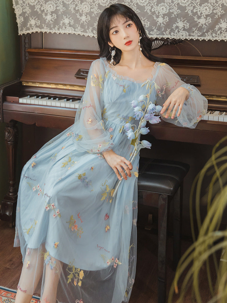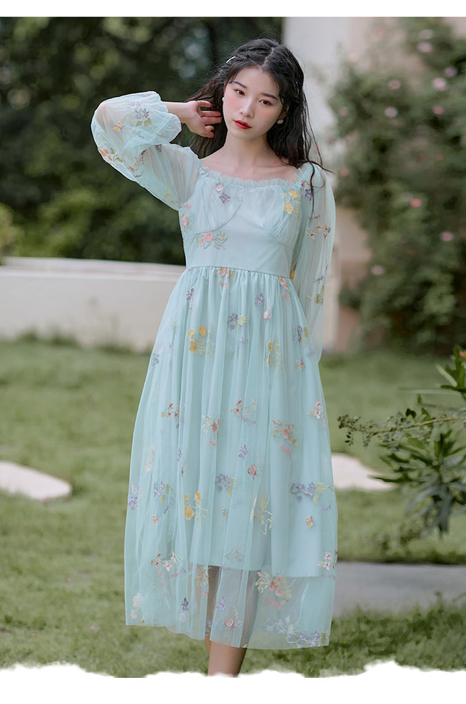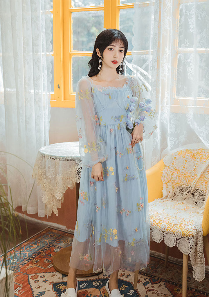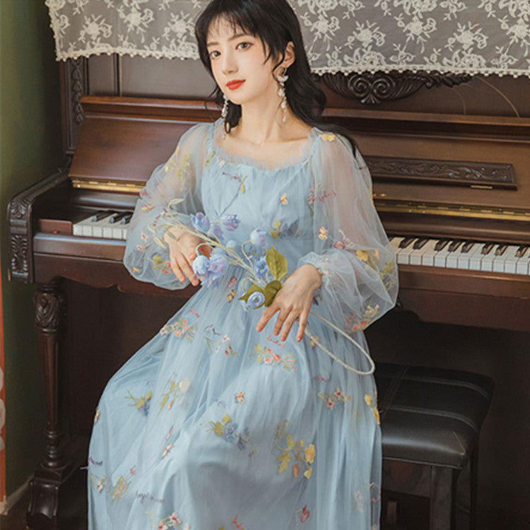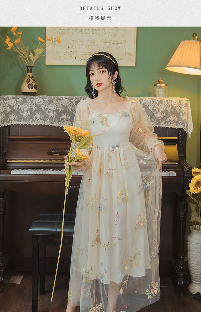 Retro Style Lace Mesh Double Layer Long Sleeved Holiday Women Travel Dress