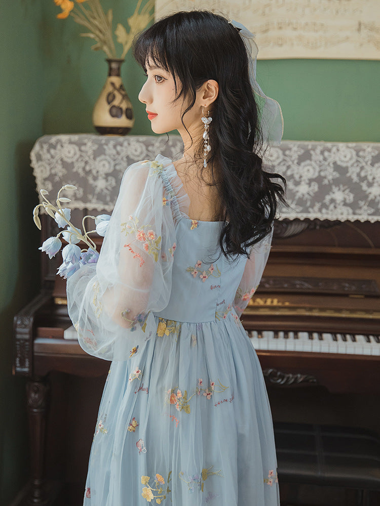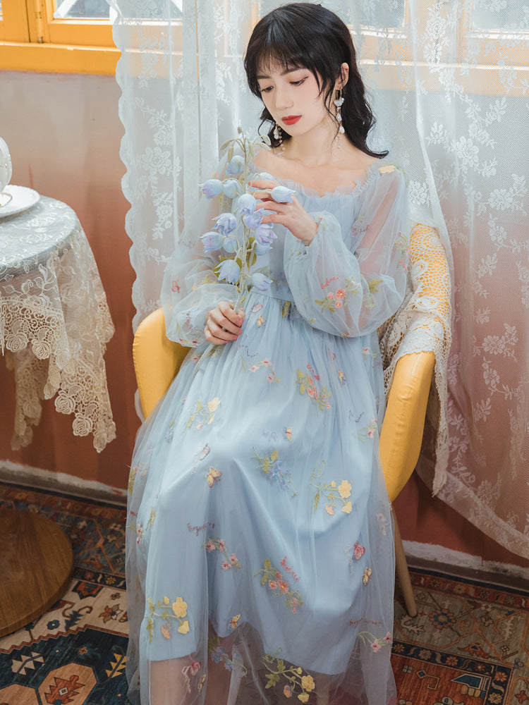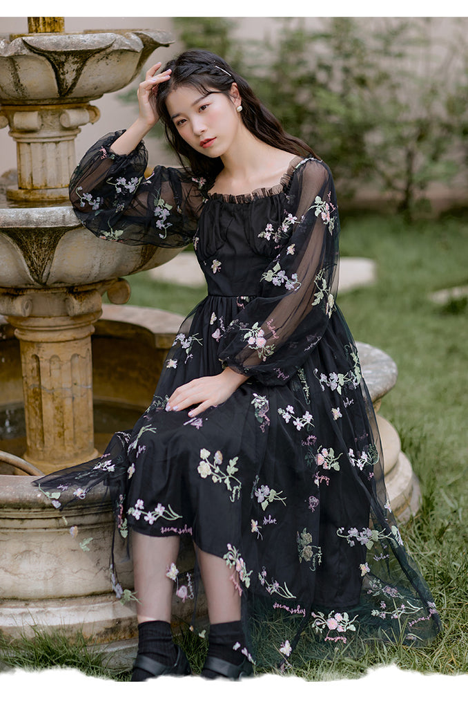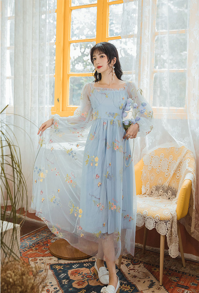 Retro Style Lace Mesh Double Layer Long Sleeved Holiday Women Travel Dress