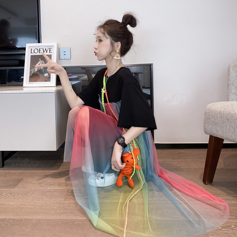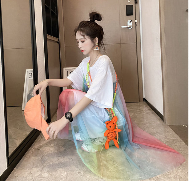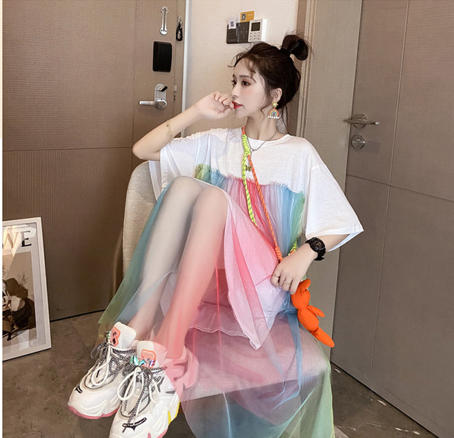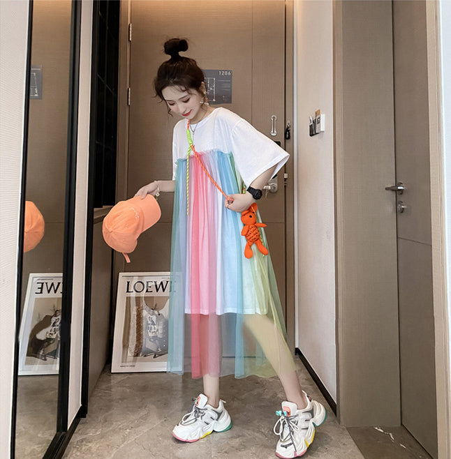 Summer Beautiful Sweet Women Long Loose Fit Rainbow Color Mesh Stitching Short Sleeved Round Neck T-Shirt Dress