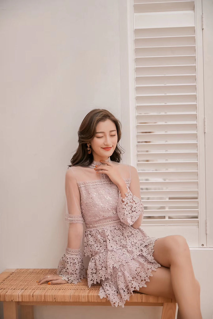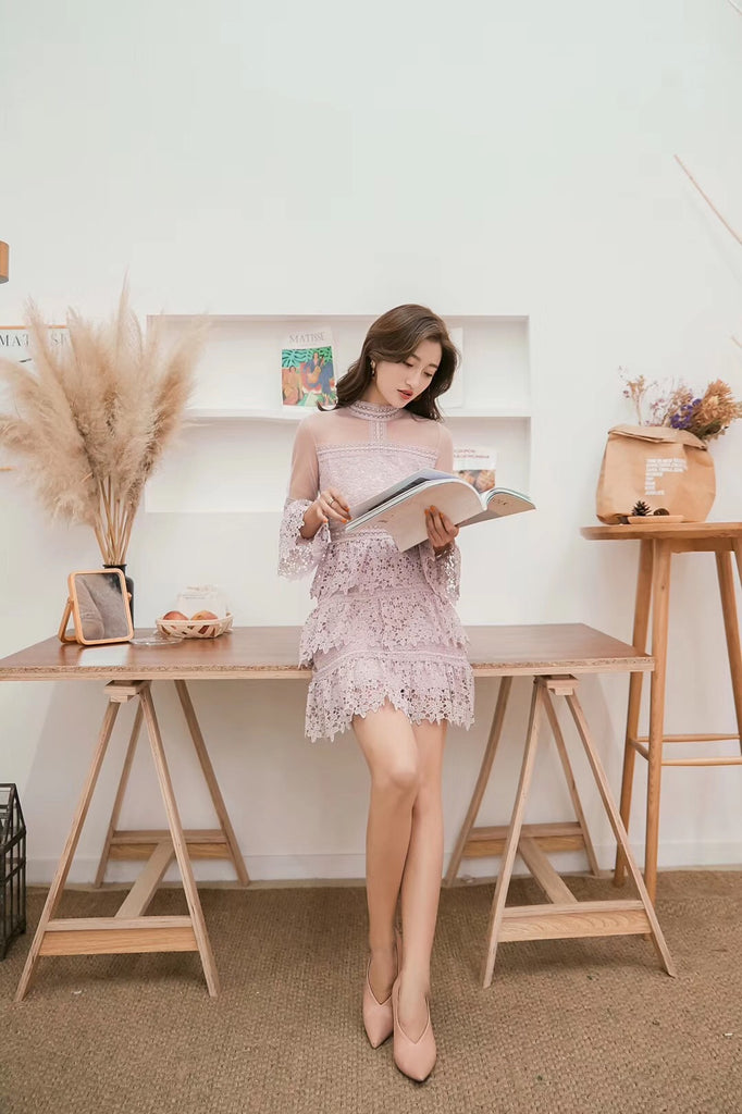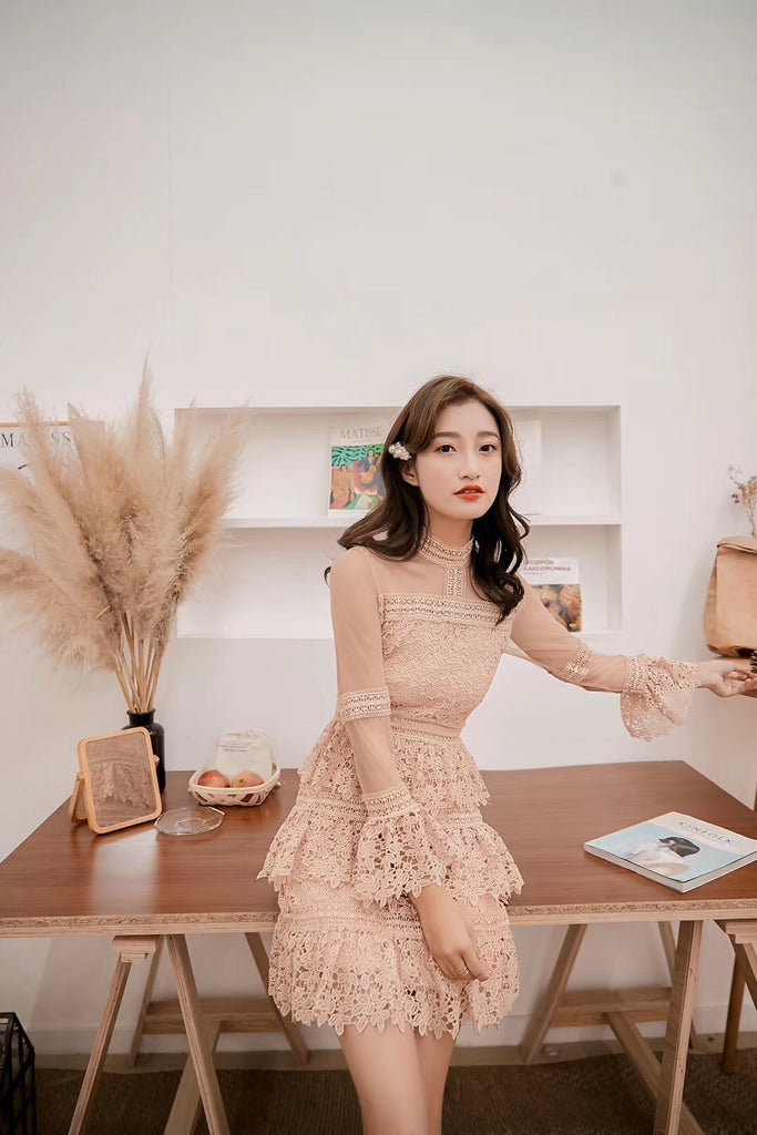 Summer Fashion Chic Cute Elegant Women Lace Stand Collar Trumpet Sleeve Ruffle Cake Birthday Party Dress
