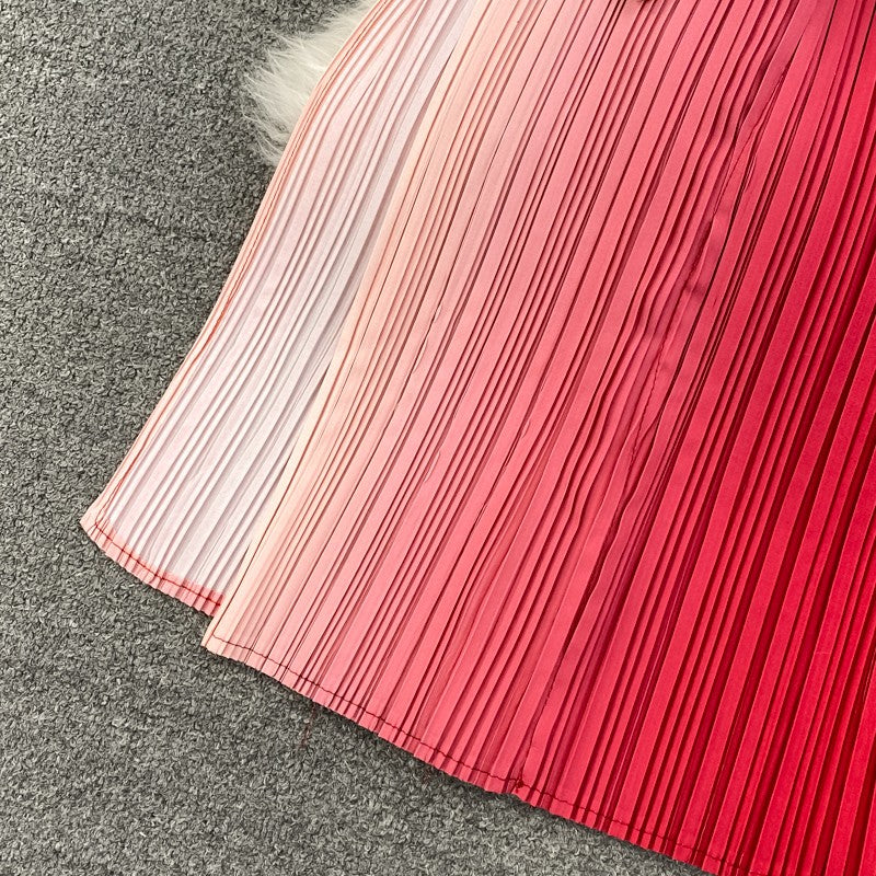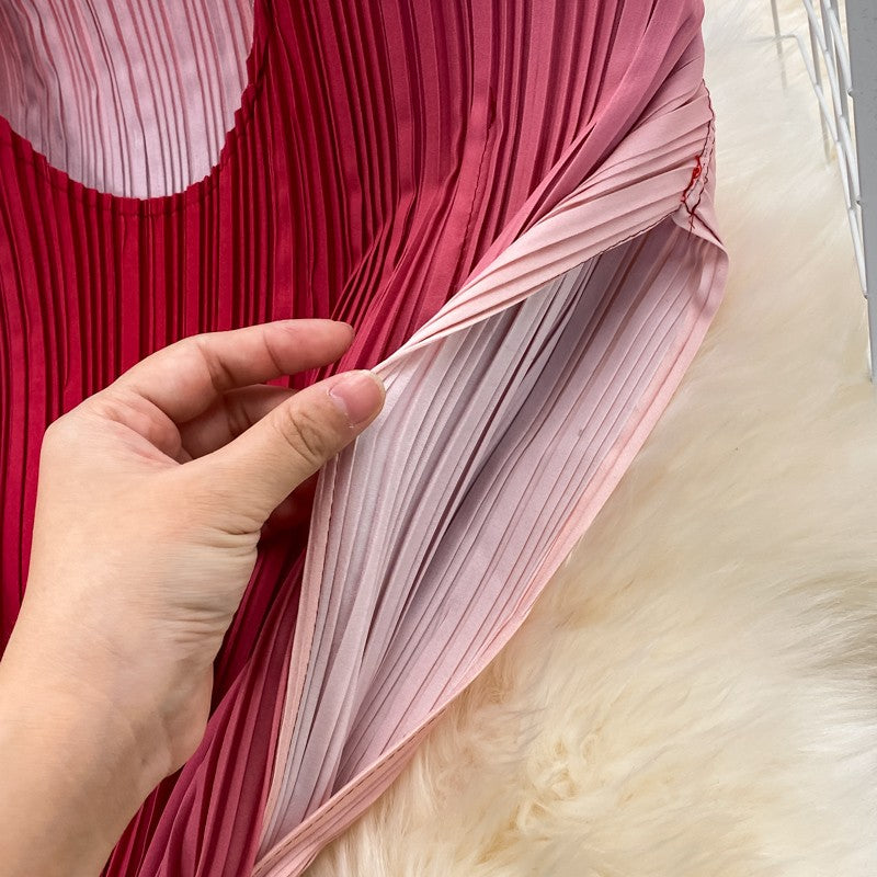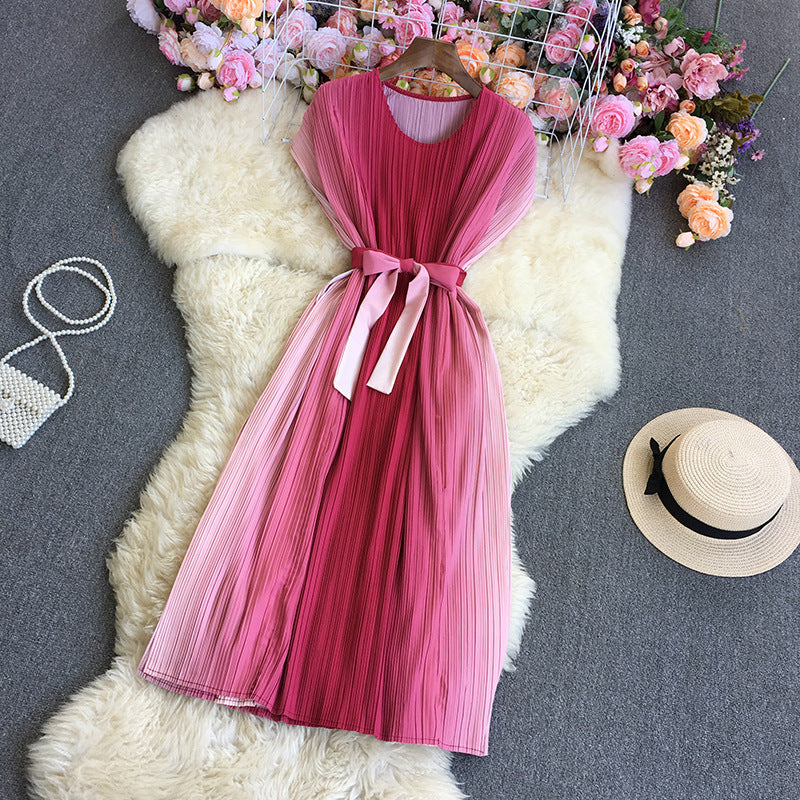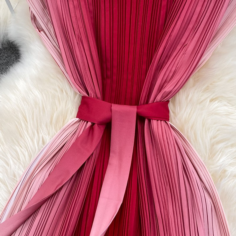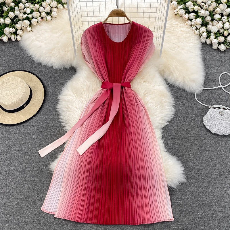 Summer Pretty Women Pleated Red Gradient Color Change Sleeveless Round Neck Waist Belt Band Size Loose Dress
