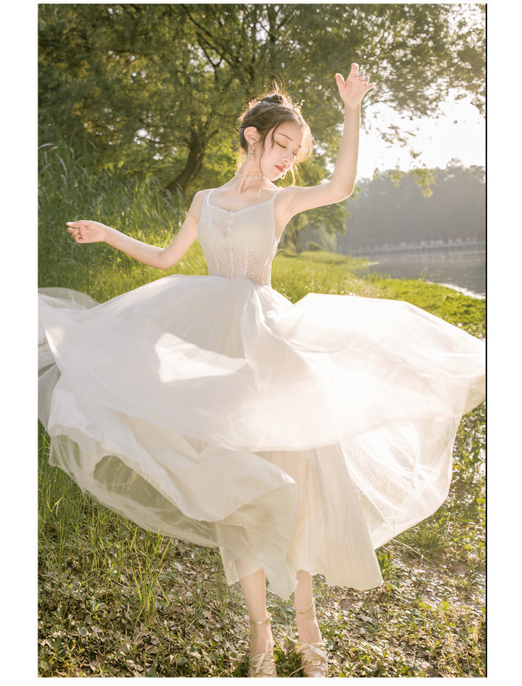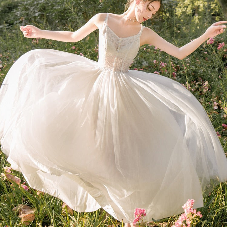 Sweet Elegant Stylish White Mesh Lace Romance Gauze Hollow Slip Big Swing Dress