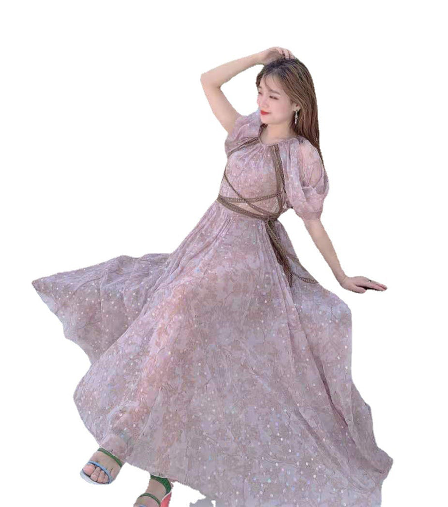 Temperament Chiffon High Waist Lace Floral Printed Long Purple Dress