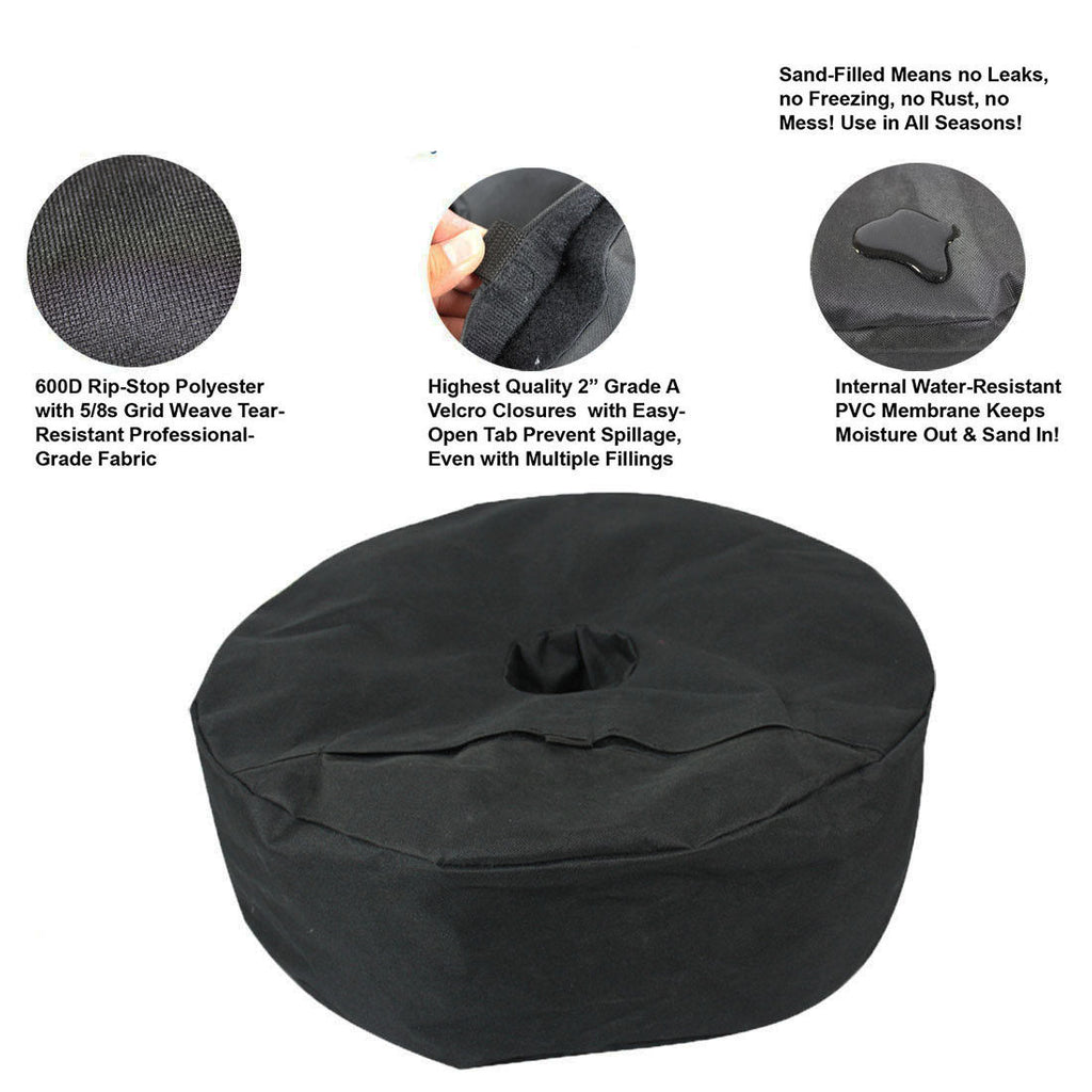 Our latest design features all new heavy duty materials - 600D Rip-stop Polyester with triple stitch locked seams. Our Tents Umbrella base weight bags are rugged and dependable, and will provide that critical extra protection when conditions call for it. Simply fill the weight bag with sand, install over the top of the umbrella stand post, and you are ready to go. Our new round weight bag design complements the shape of your round umbrella stand, all while adding the extra weight needed to keep your umbrella where it should be.