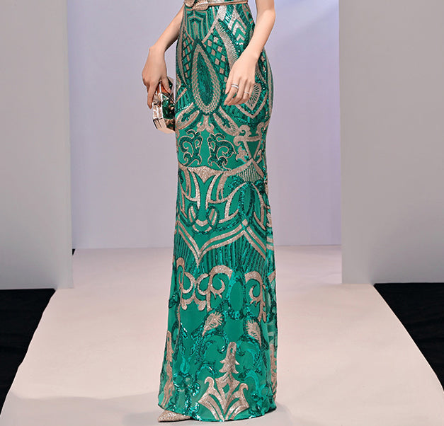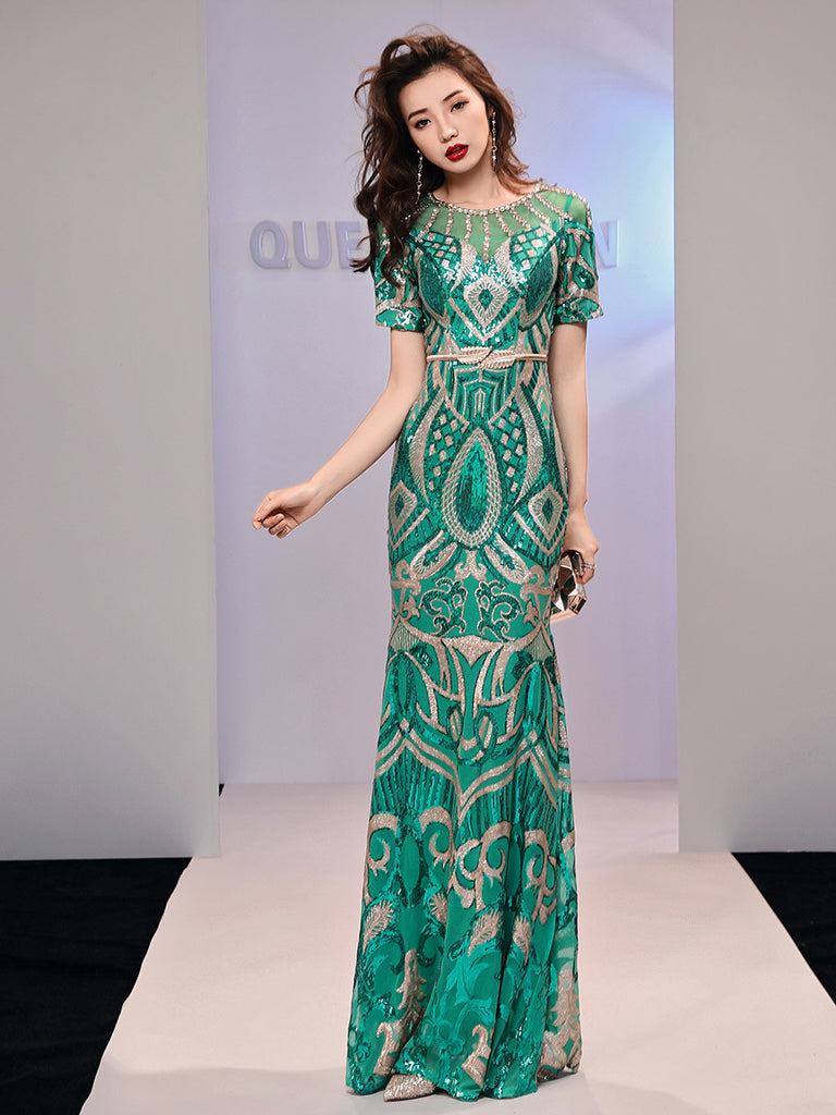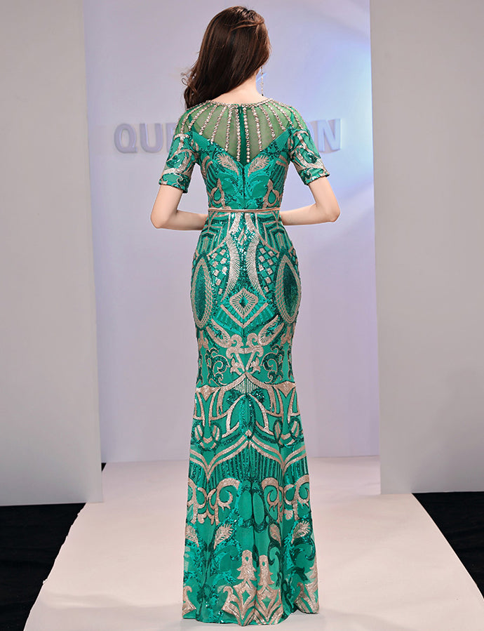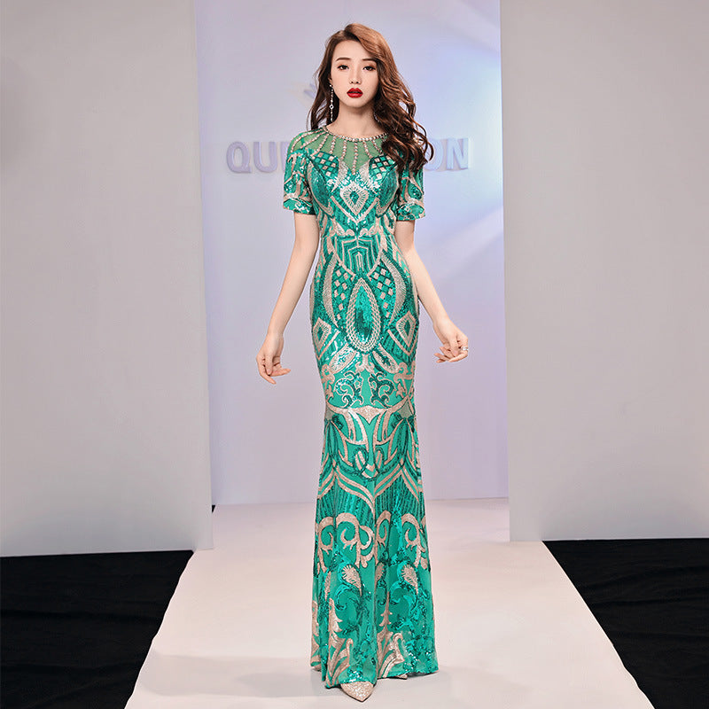 Amazing Evening Elegant Women Banquet Birthday Party Embroidered Round Neck Short Sleeves Fishtail Long Dress