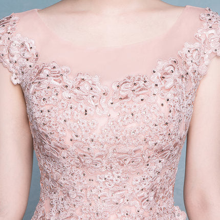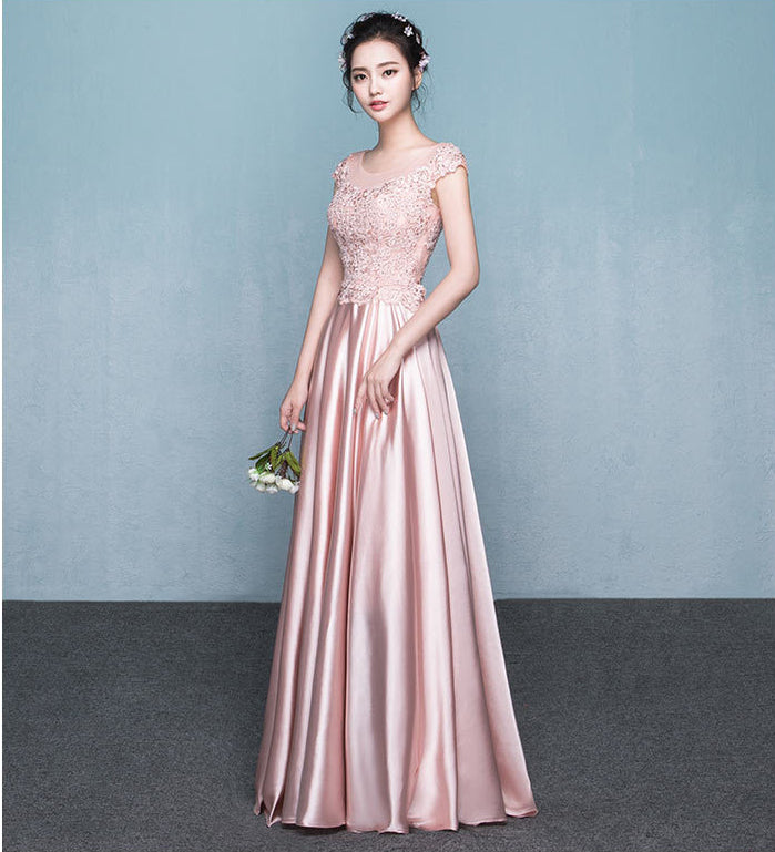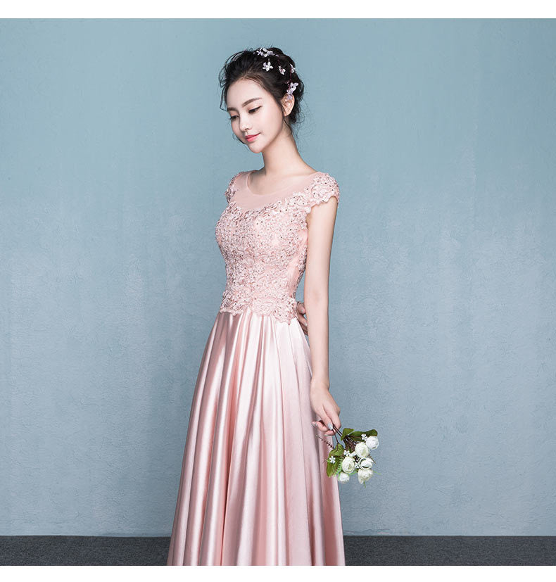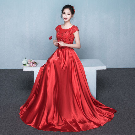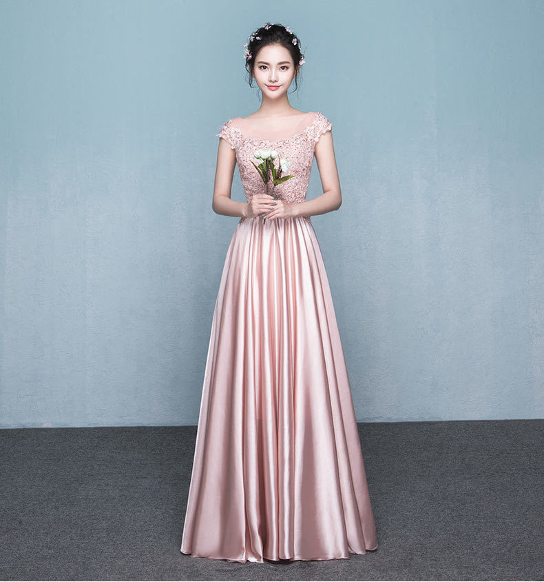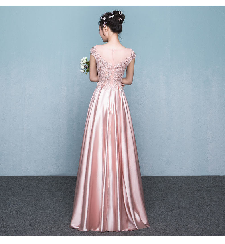 Amazing Sweet Women Round Neck Short Sleeves High Waist Evening Satin Gown Dress