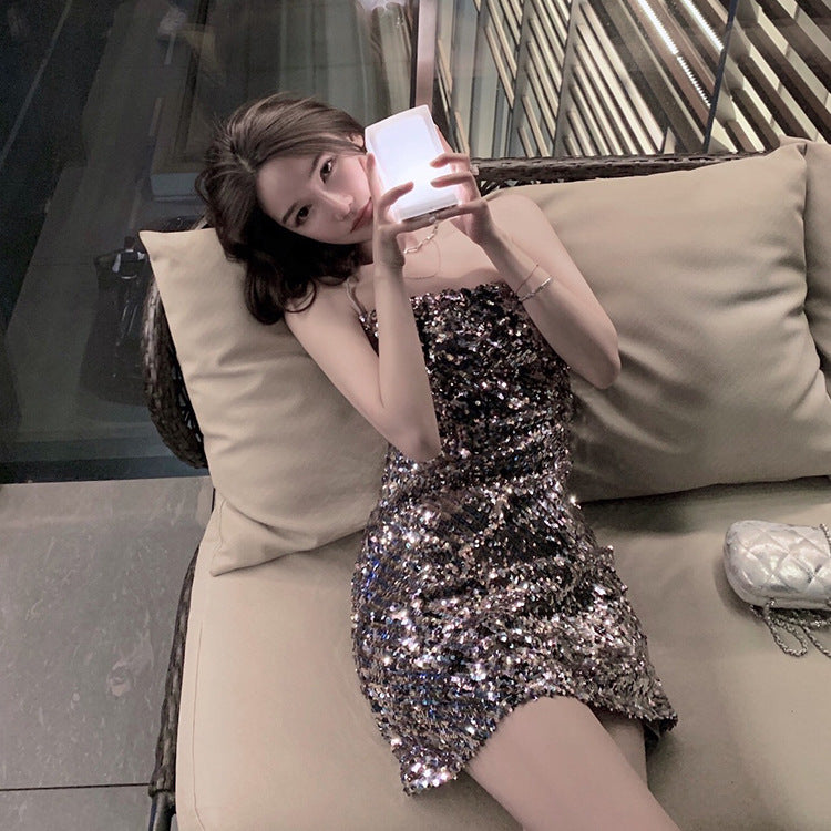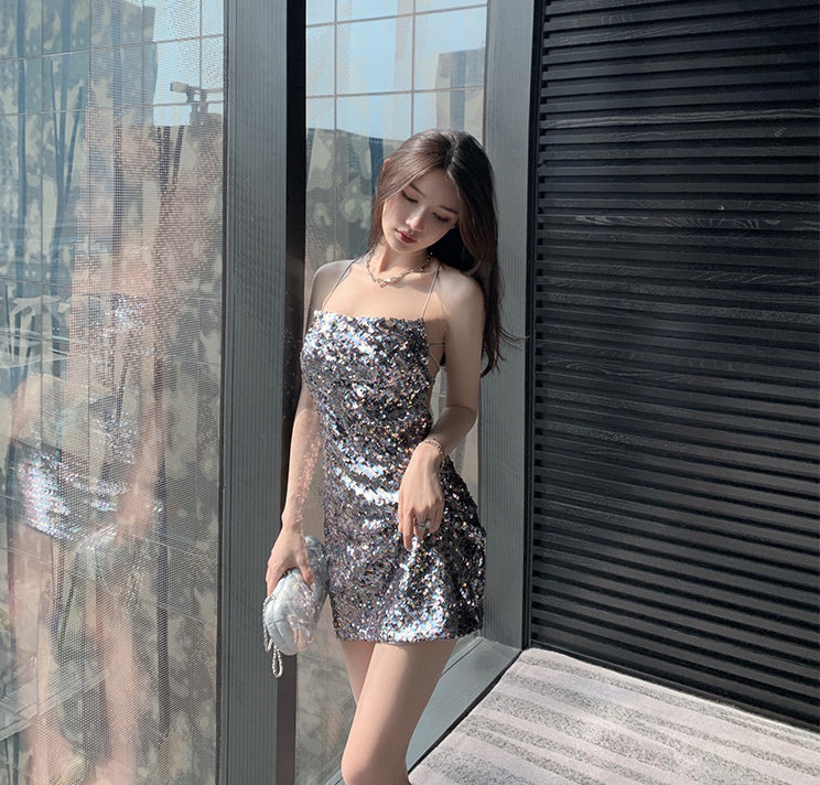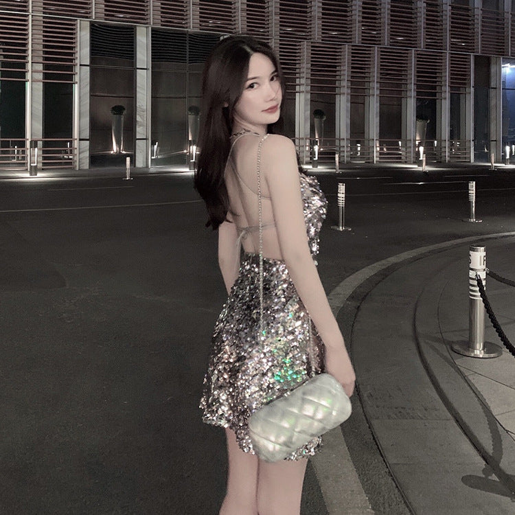 Pattern: Colorful Striped Sequins, Backless Spaghetti Strap, Sparkling Dress