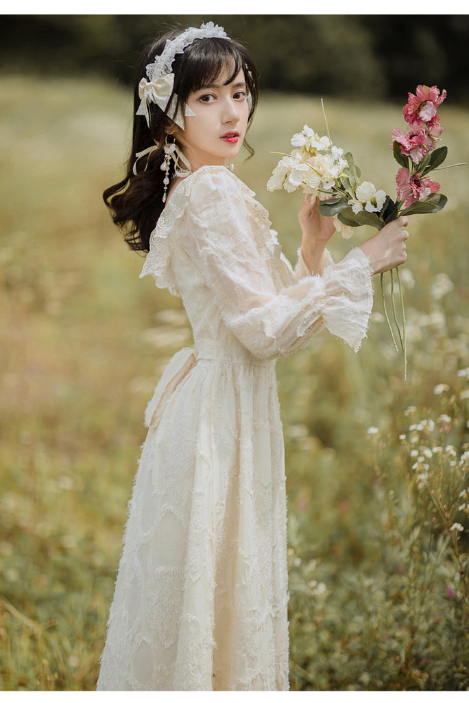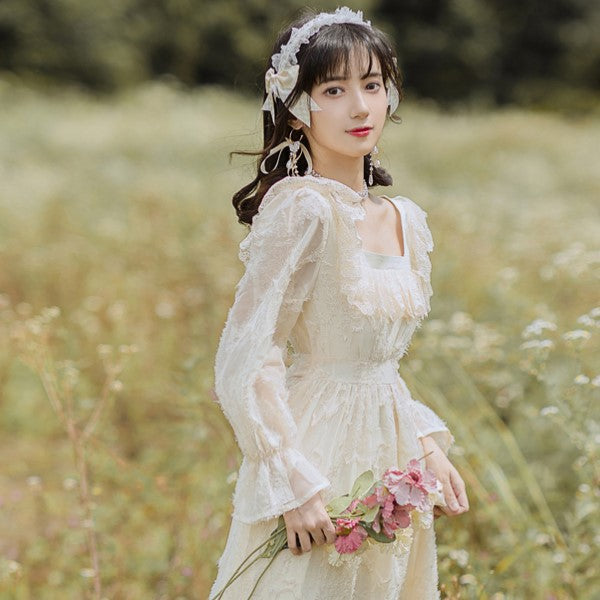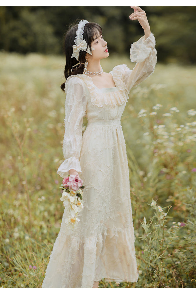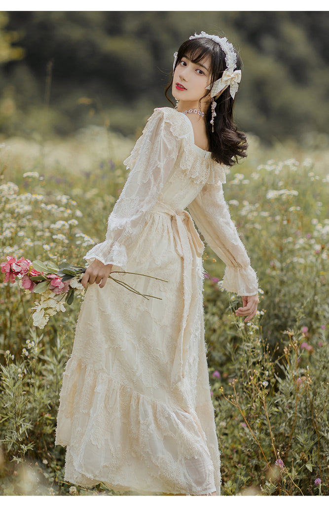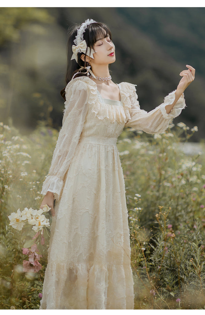 Autumn Long Sleeved Retro Temperament Ladies Princess Square Neck Collar Lace Ruffled Dress