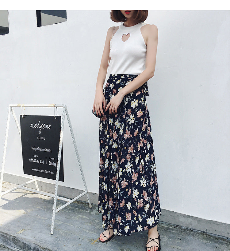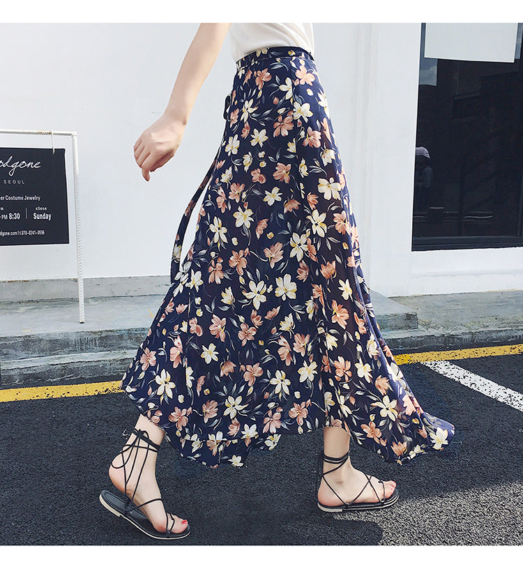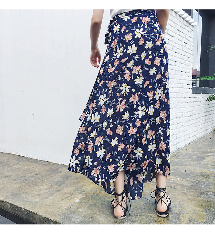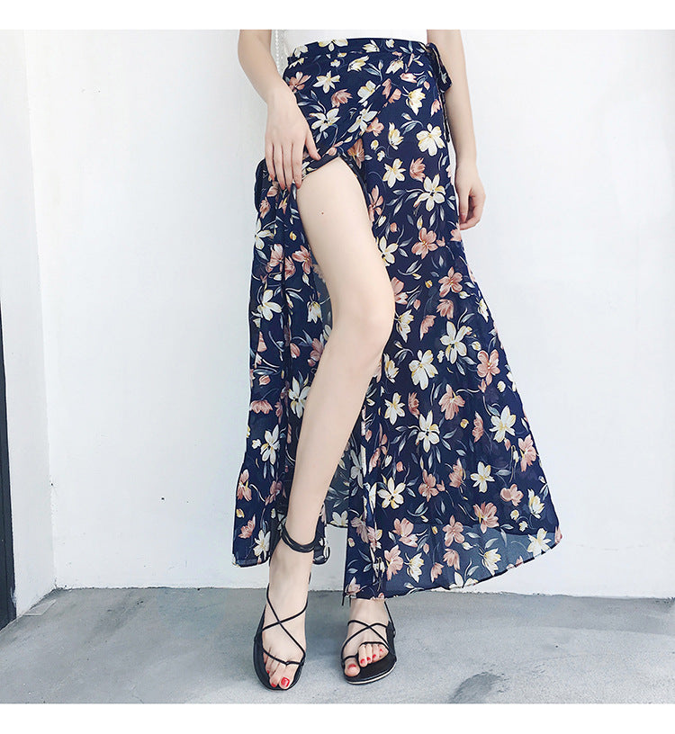 Beach Summer Holiday Women Fashion Bohemian Floral Printed Chiffon Mid Length Wrap One Piece Side Split Skirt