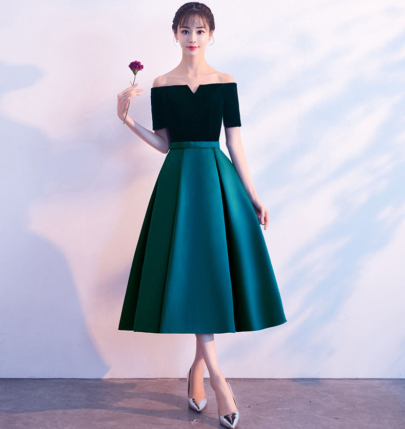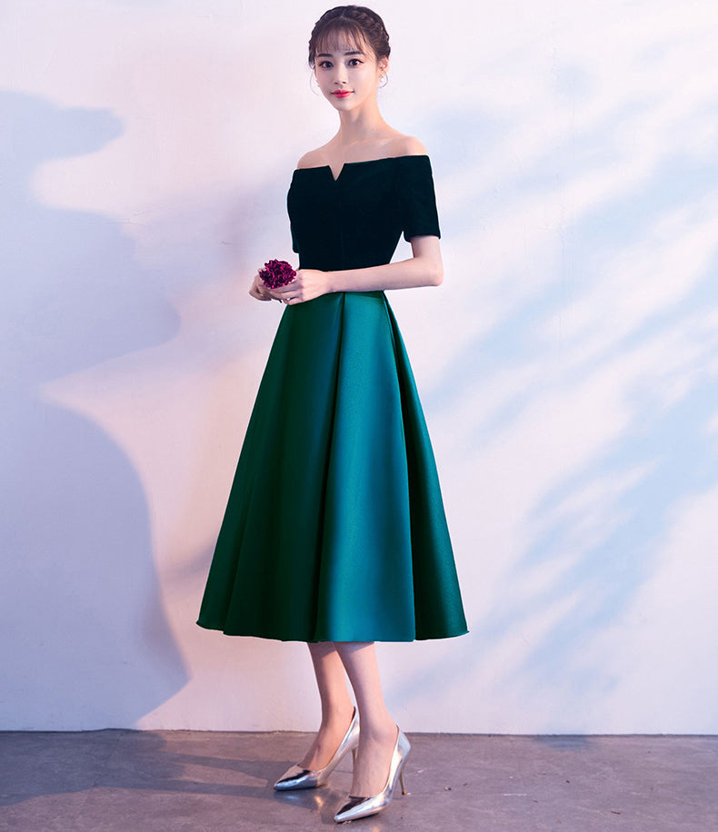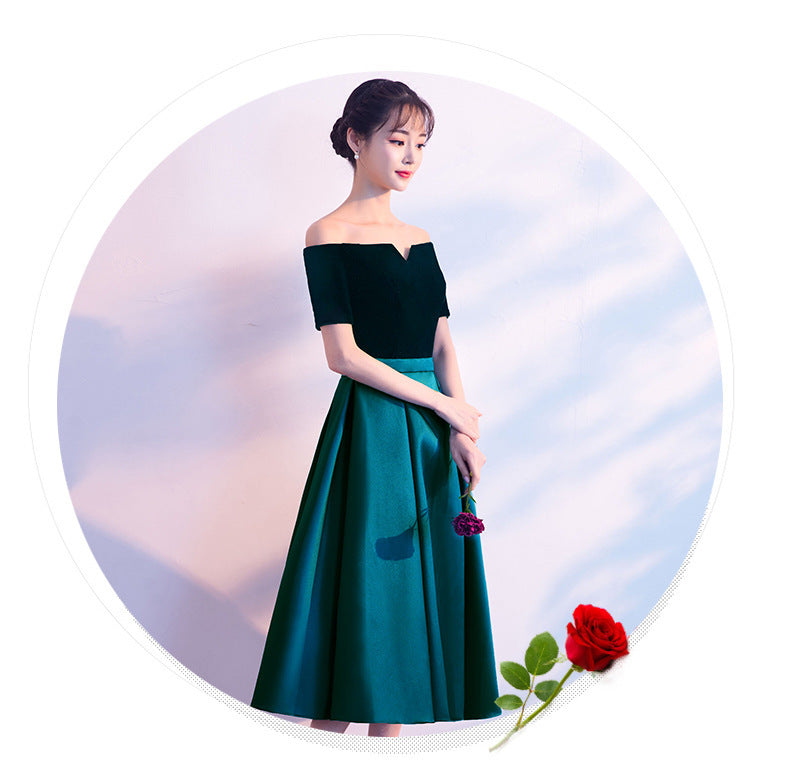 Beautiful Women Cute Tea Length Green Velvet Off Shoulder Evening Party Banquet Bridesmaid Mid Length Dress