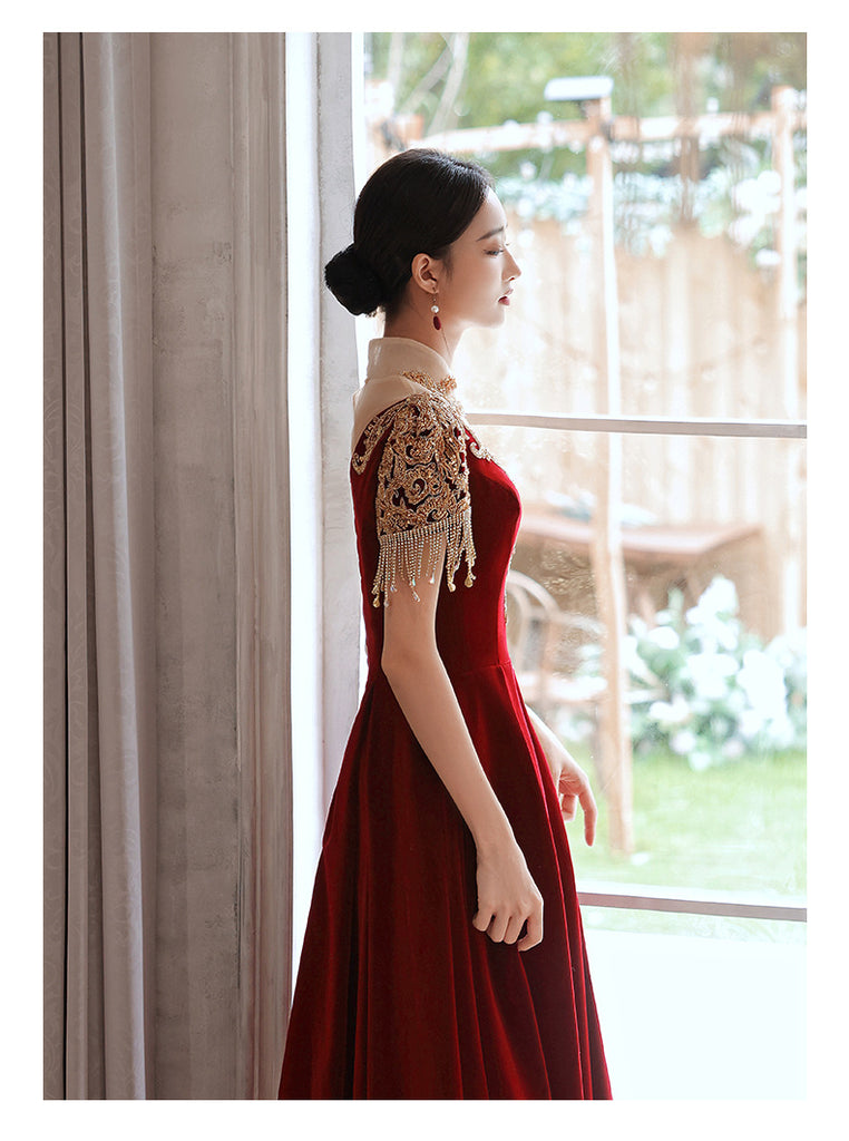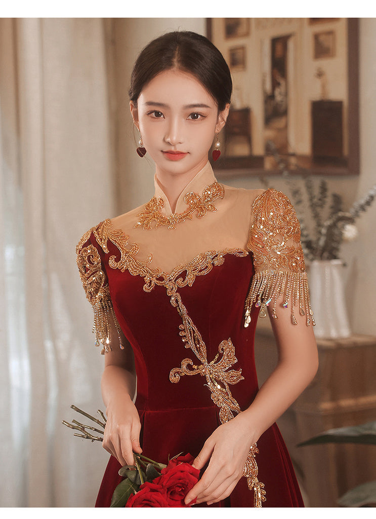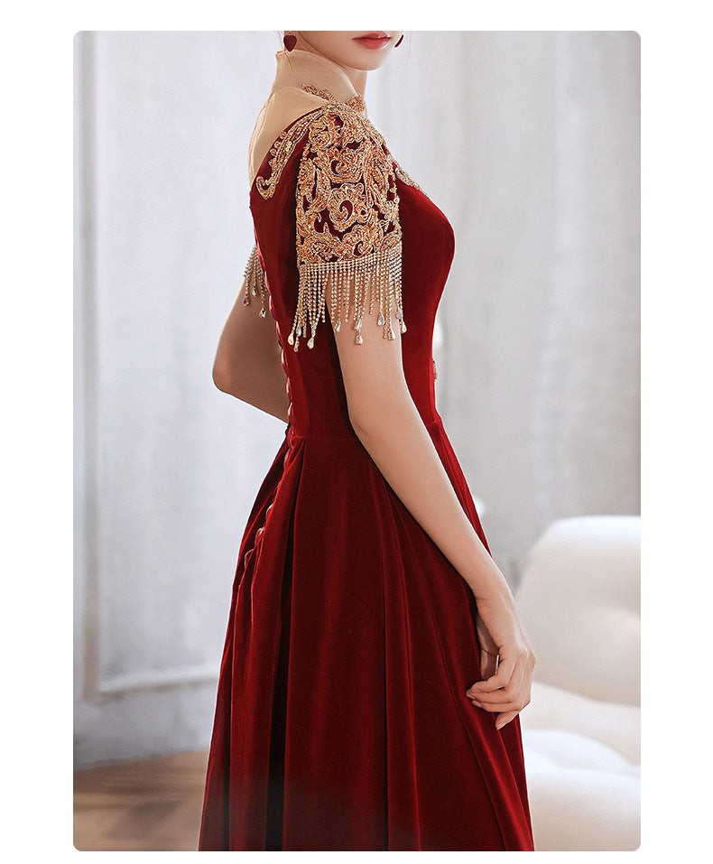 Chic Beautiful Burgundy Princess High Neck Beading Pearl Rhinestone Short Sleeve Velour Evening A-Line Floor Length Party Formal Dresses