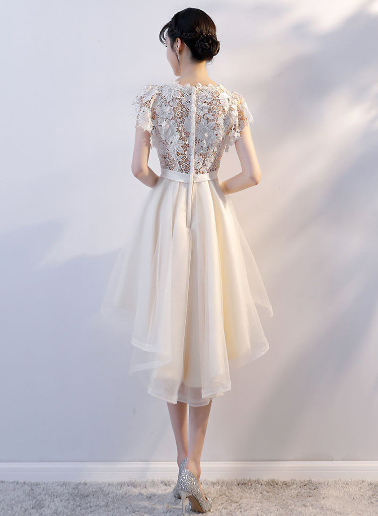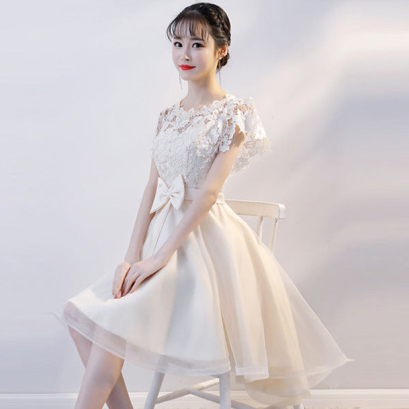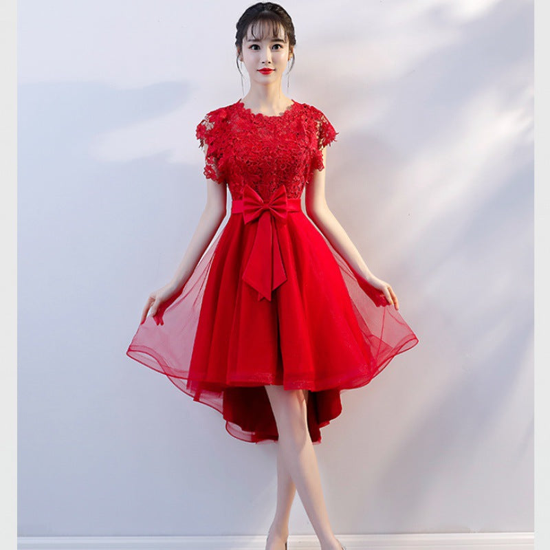 Cozy Evening Women Waist Stitching Mesh Mid Length Irregular Front Bow Tutu Bridesmaid Cocktail Lace Dress