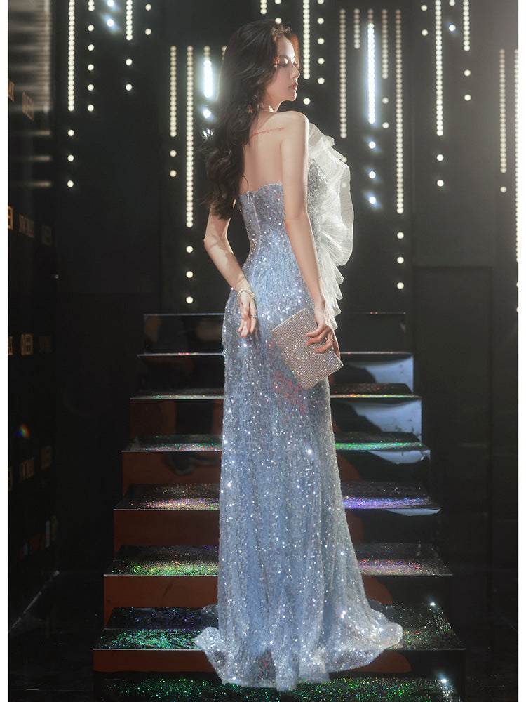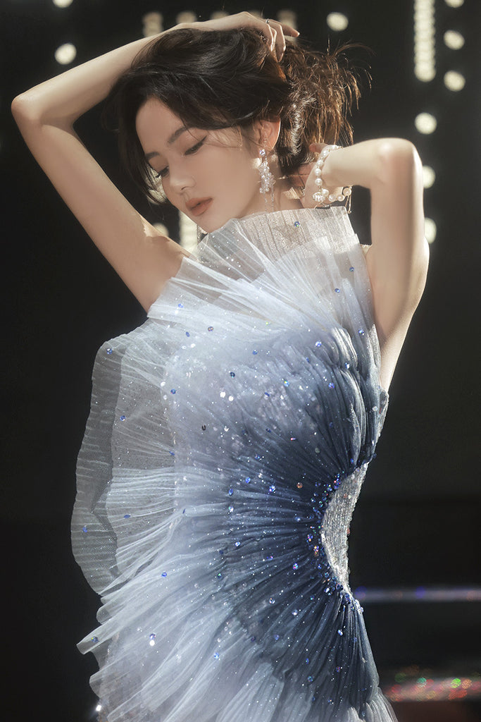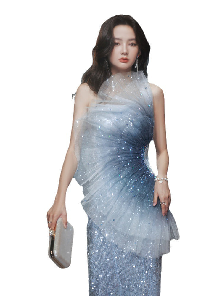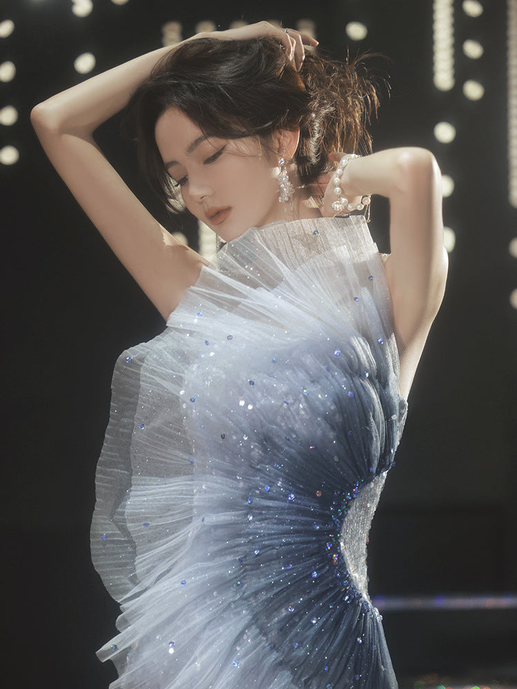 Elegant Beauty Ladies Gradient Blue Color Change Tube Top Off Shoulder Fishtail Show Evening Dress