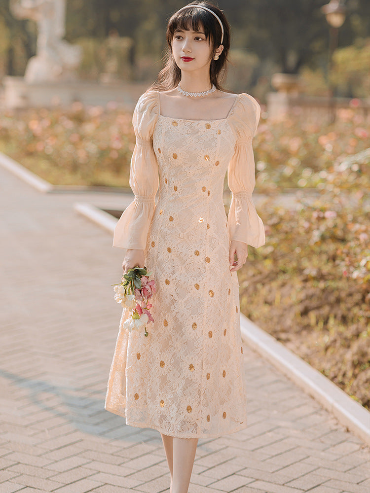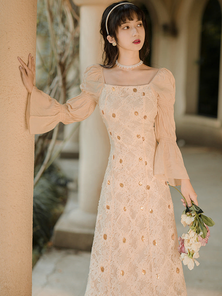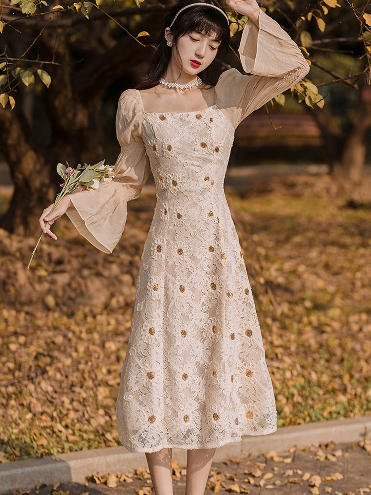 Elegant Lace Women Retro Fairy Chic Square Collar Holiday Party Dress
