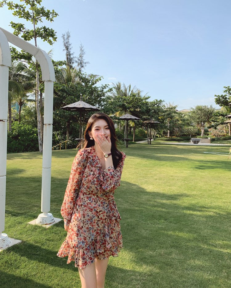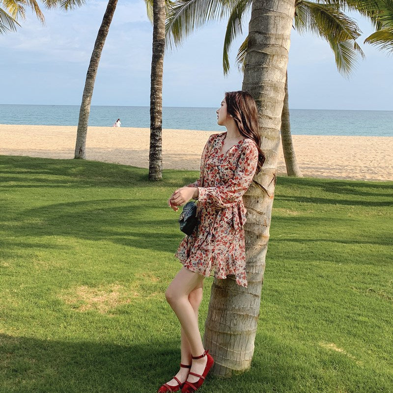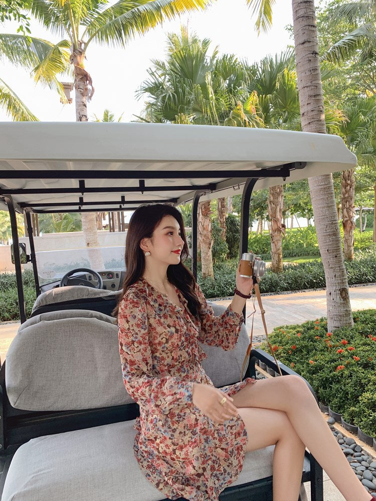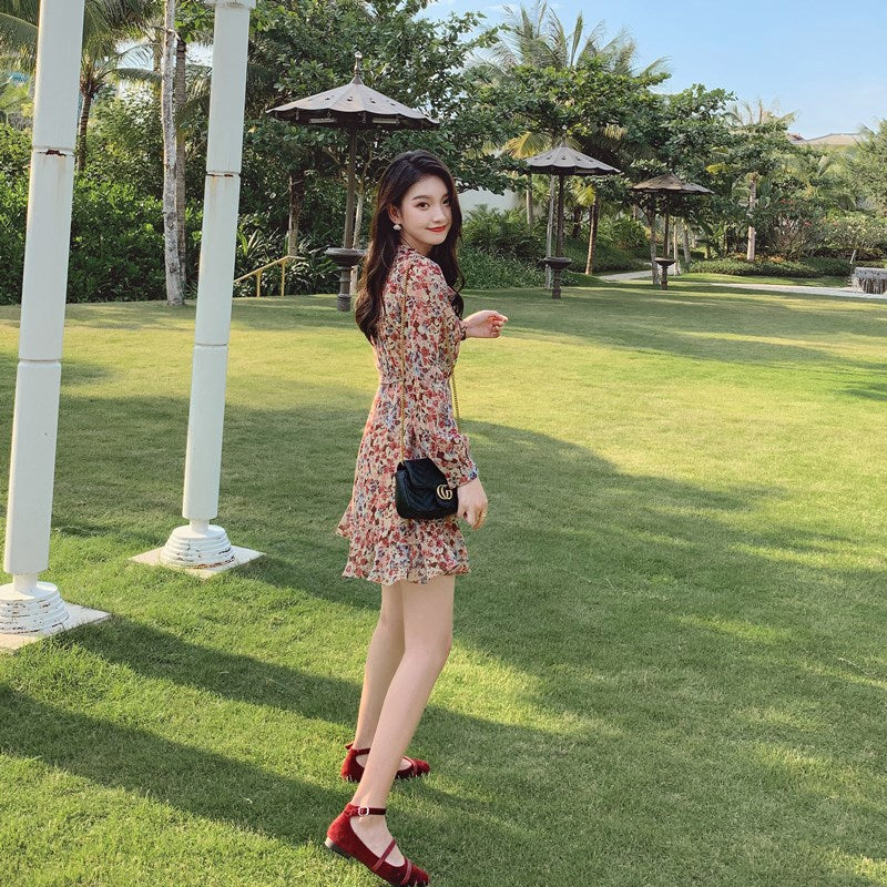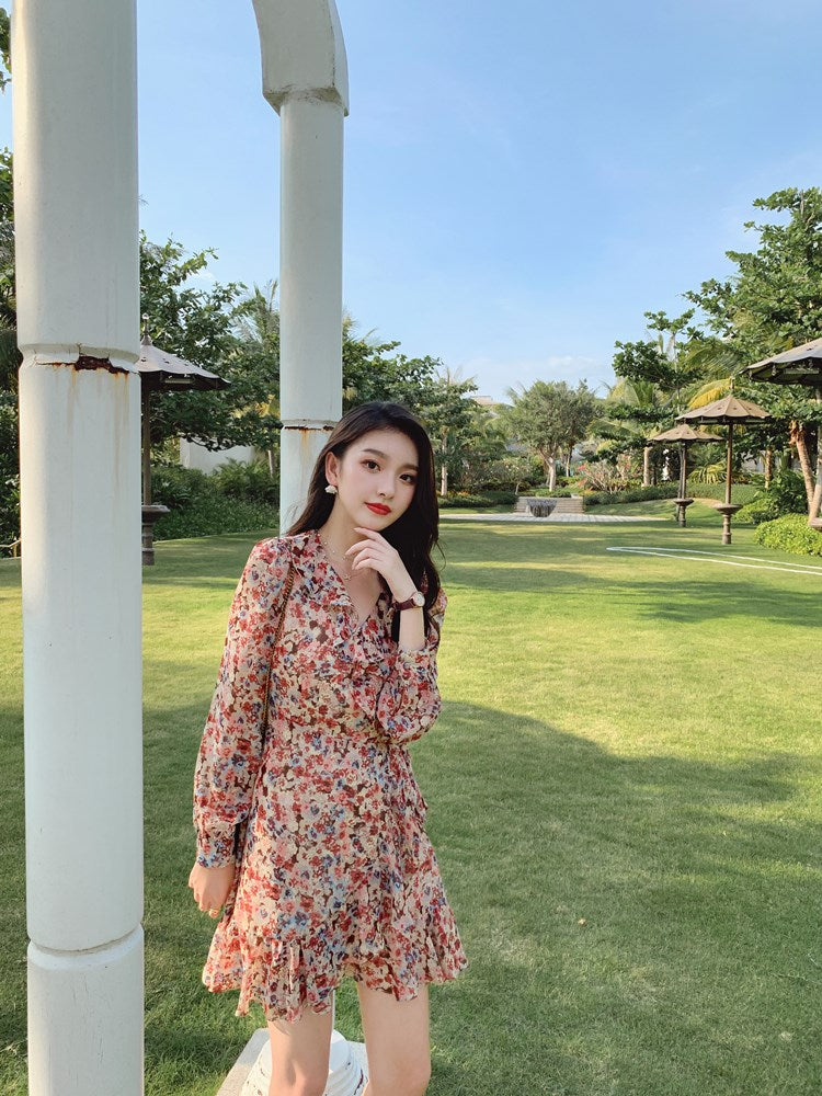 Elegant Long Sleeved Floral lotus leaf Collar V Neck Printed A Line Women Dress