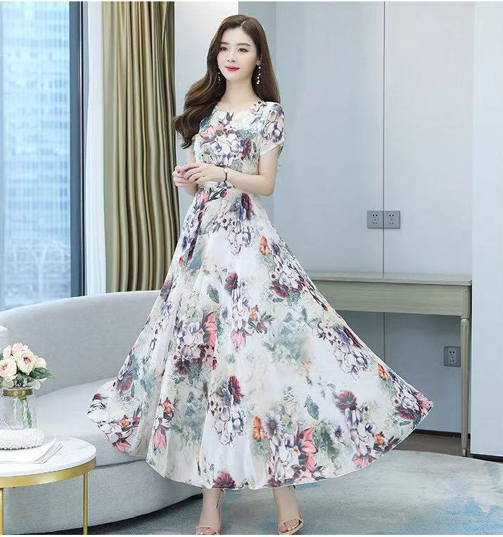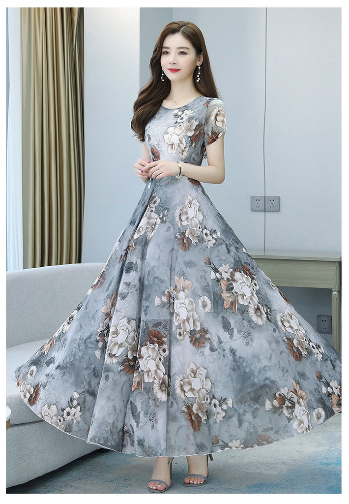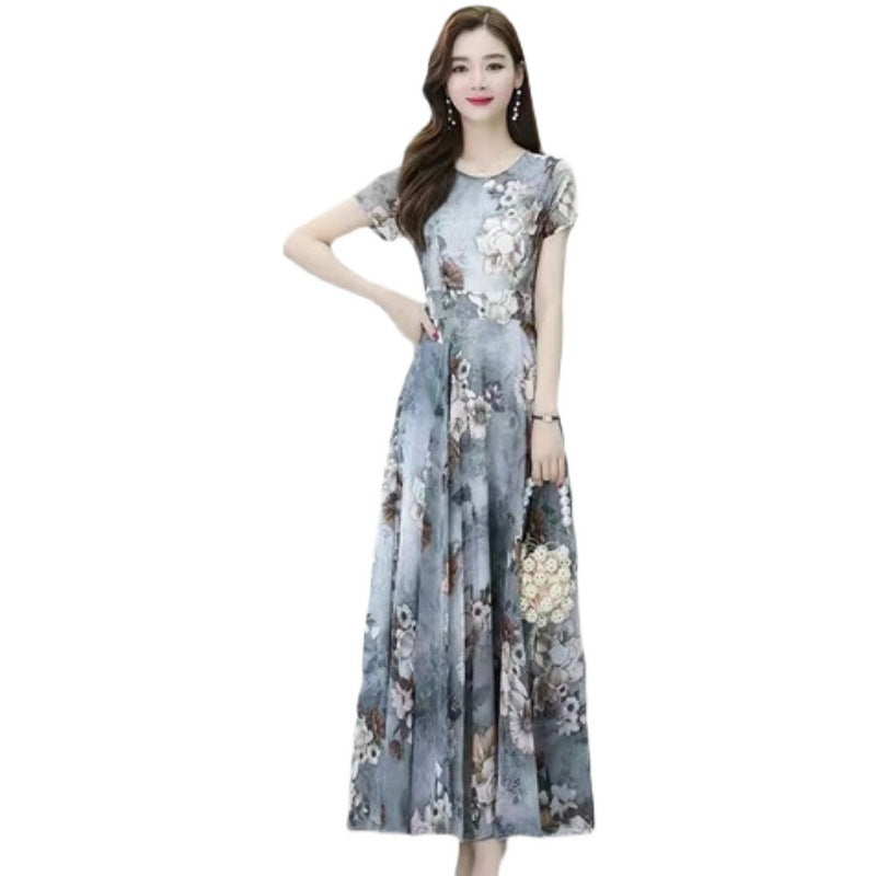 Elegant Sweet Women Cozy Short Sleeved Printed Silk Liked Retro Beach long Skirt Swing Maxi Dresses