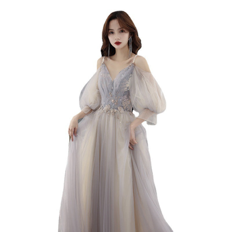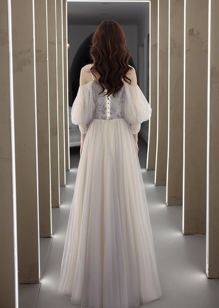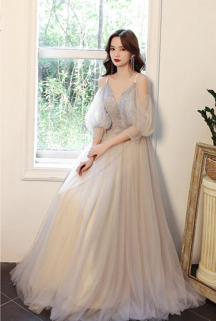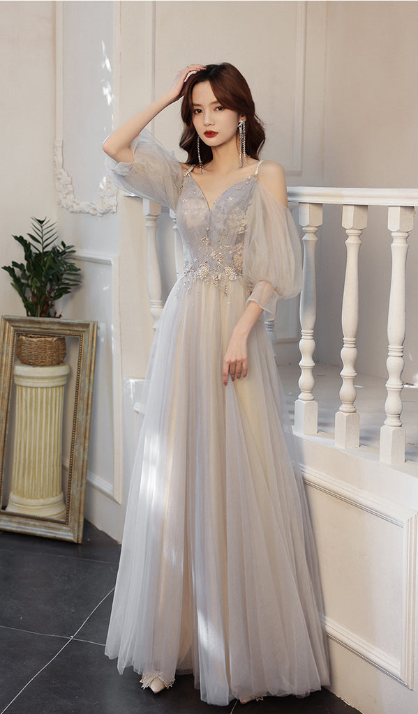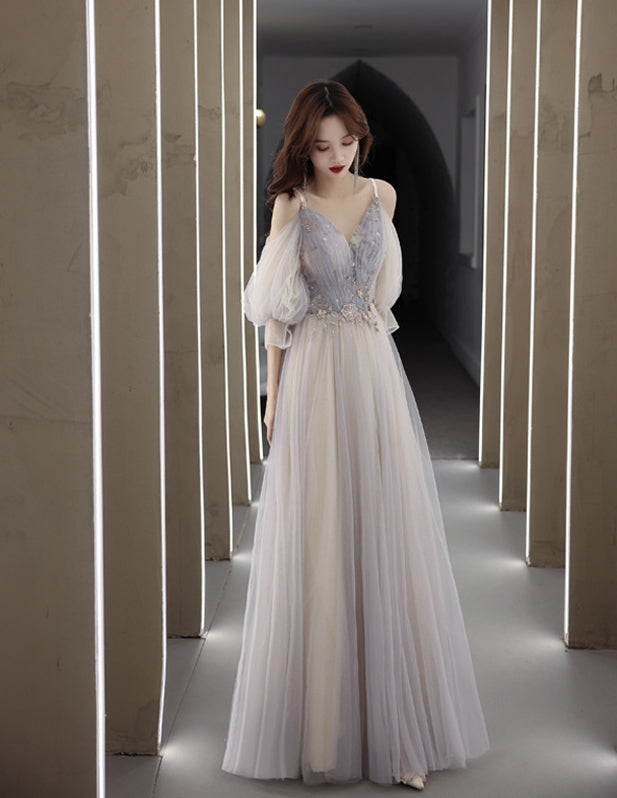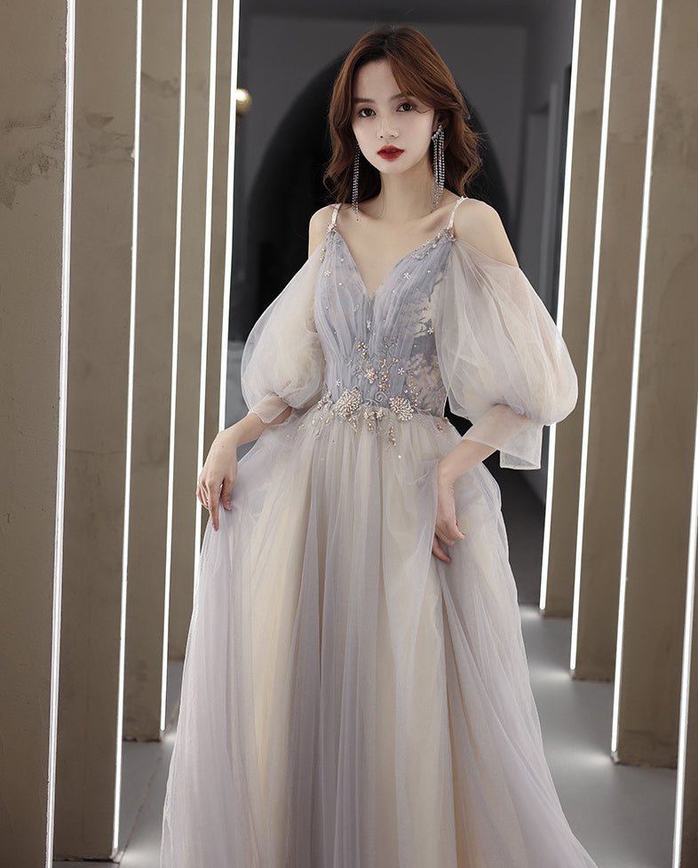 Elegant Temperament Fairy Women Gray V neck Spaghetti Strap A line Tulle Formal Long Prom Dress