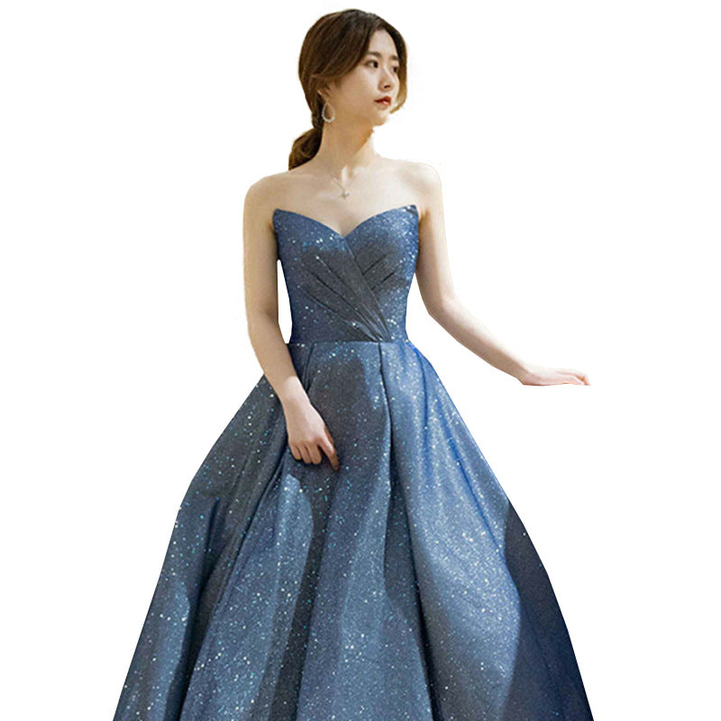 Elegant Women Royal Blue Blink Solid Color Strapless Evening Princess Sweetheart High Waist A Line Prom Dress