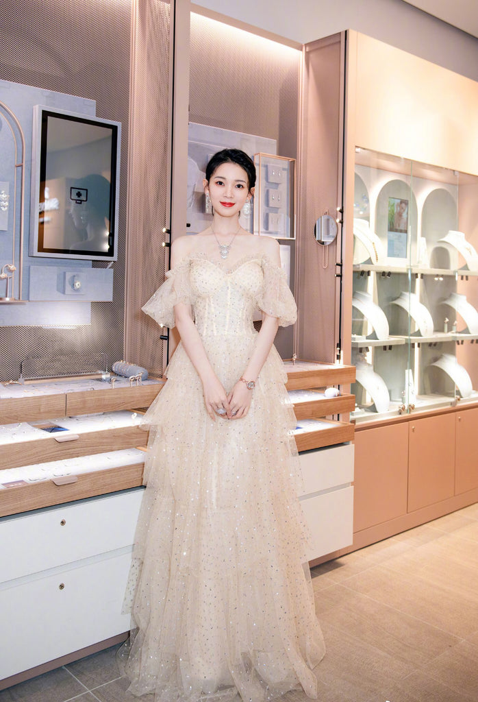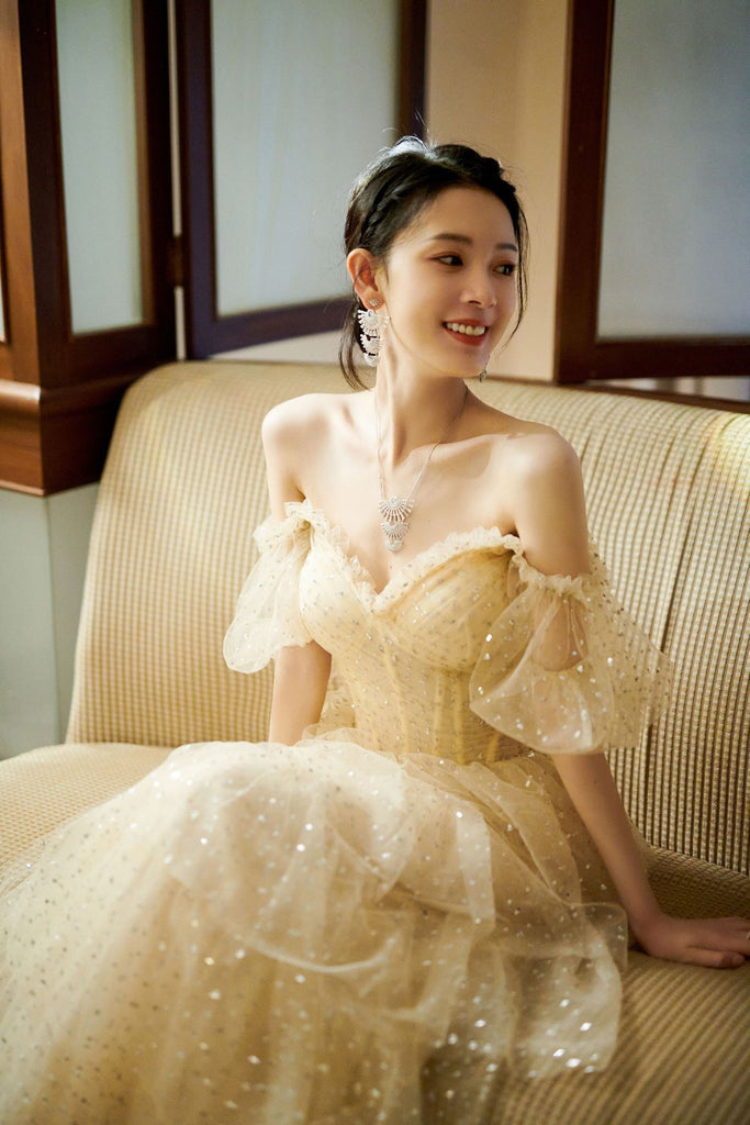 Evening Champagne Sweet Shining Dot Layers Off Shoulder Puff Sleeves Mesh Sequin Cake Long Dinner Dress