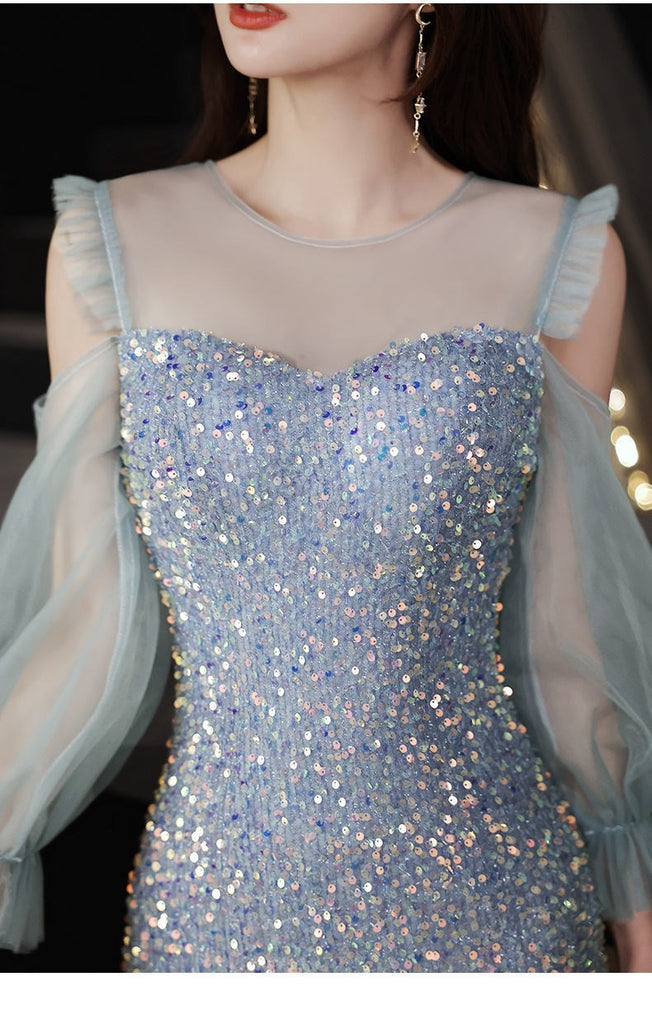 Evening Trendy Temperament Women Banquet Luxury Blue Long Mesh Sleeves Ball Party Fishtail Dress