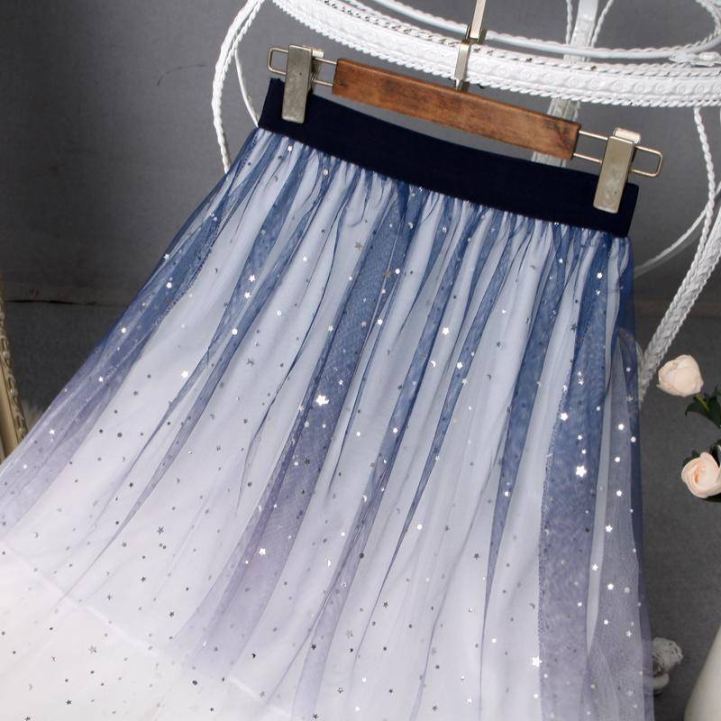 Fairy Women Gradient Blue White Colors Pleated Long Skirt Starry Sky Sequin Mesh Lace Tulle A Line Dress Dresses