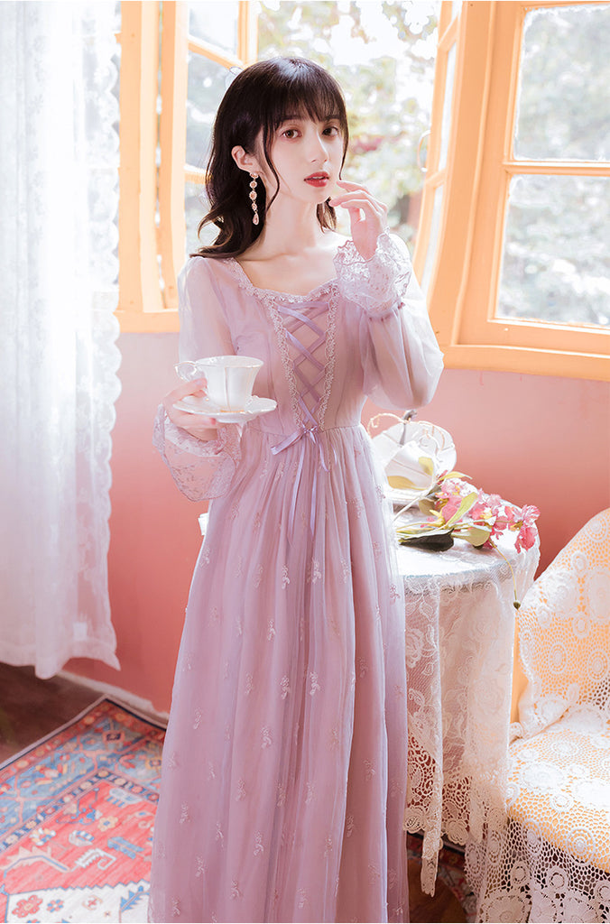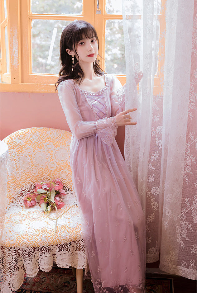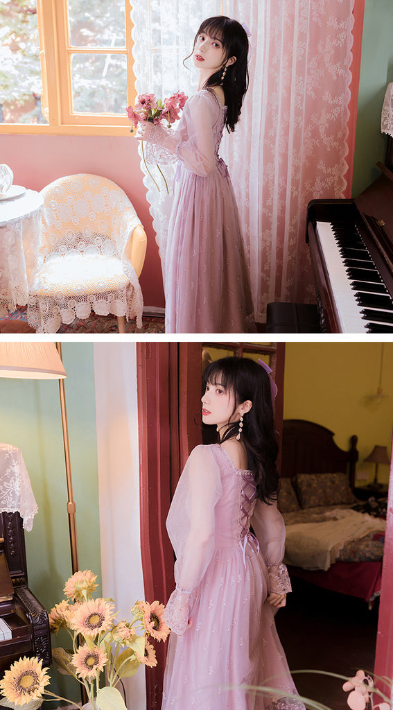 Fairy Women Princess Vintage Mesh Lilac Lace Embroidered Square Neck Long Sleeves Party Ball Dress