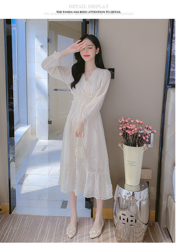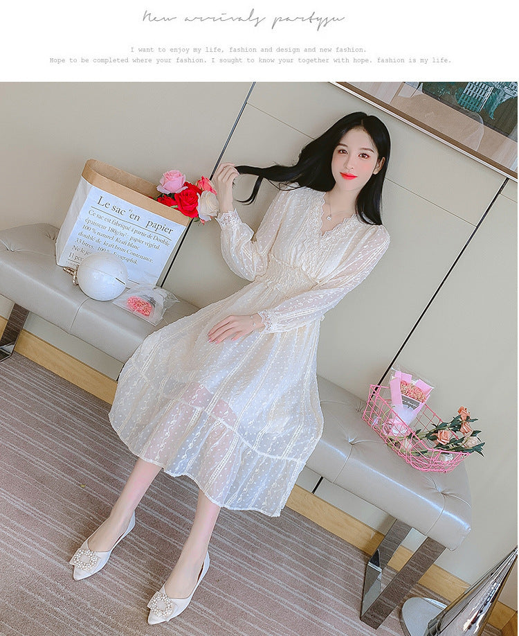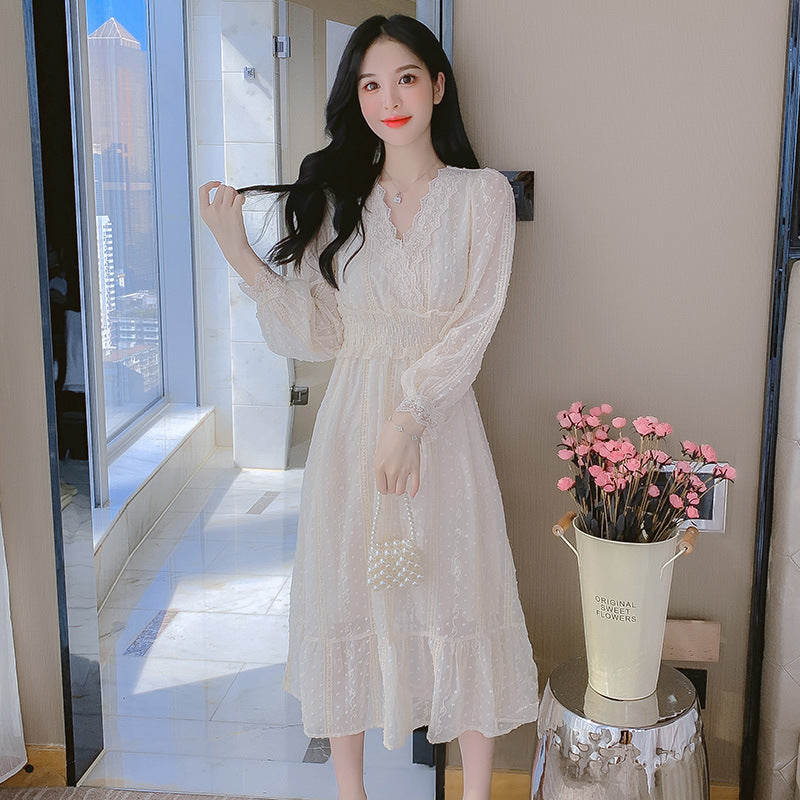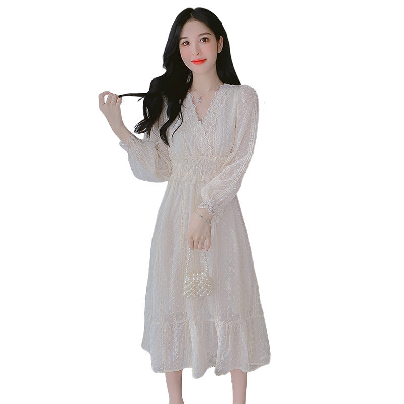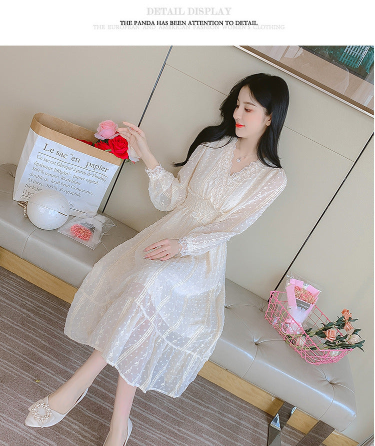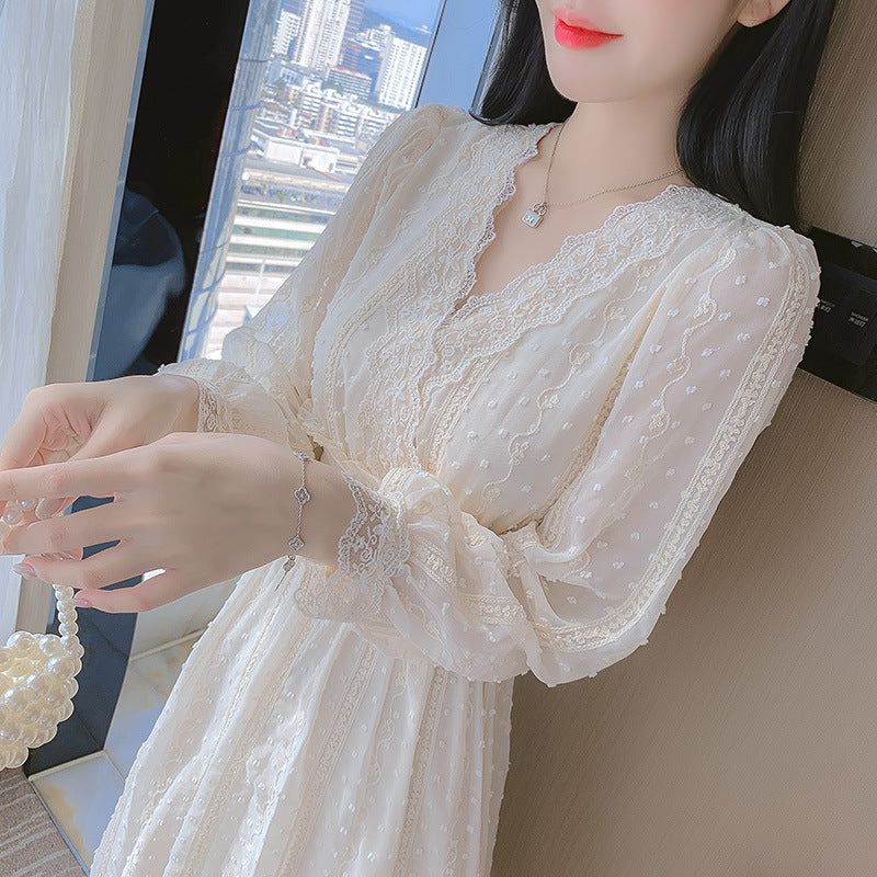 French Spring V Neck Lace Bottoming Clothing Temperament Fairy Skirt Dress
