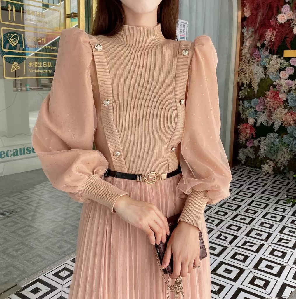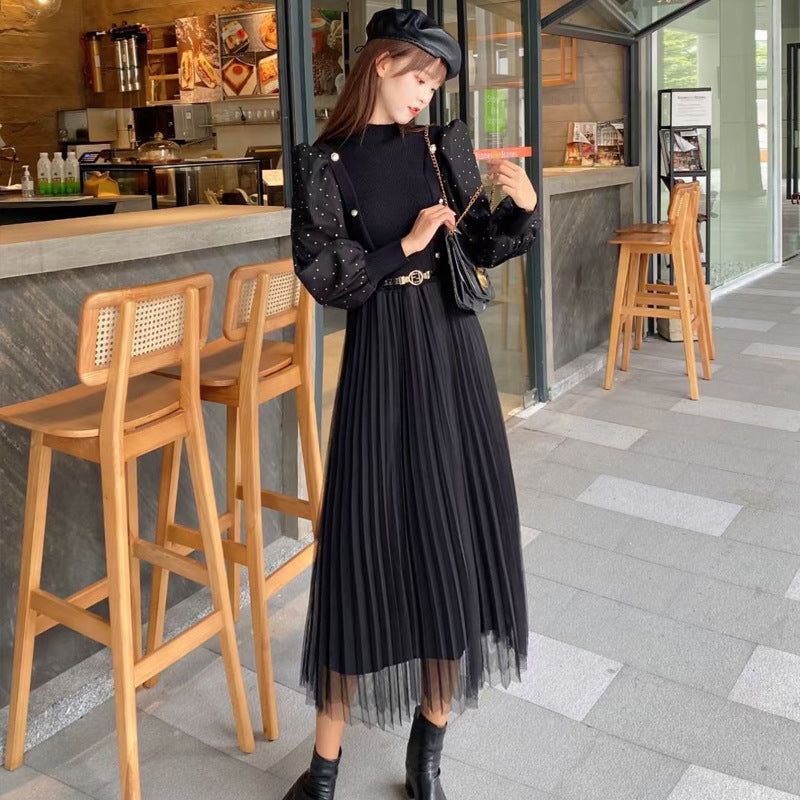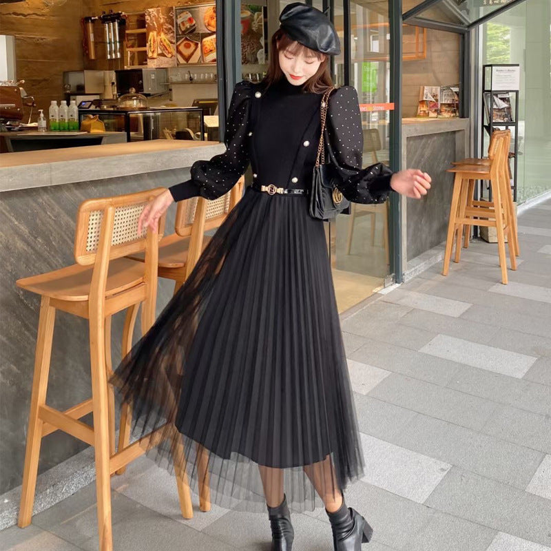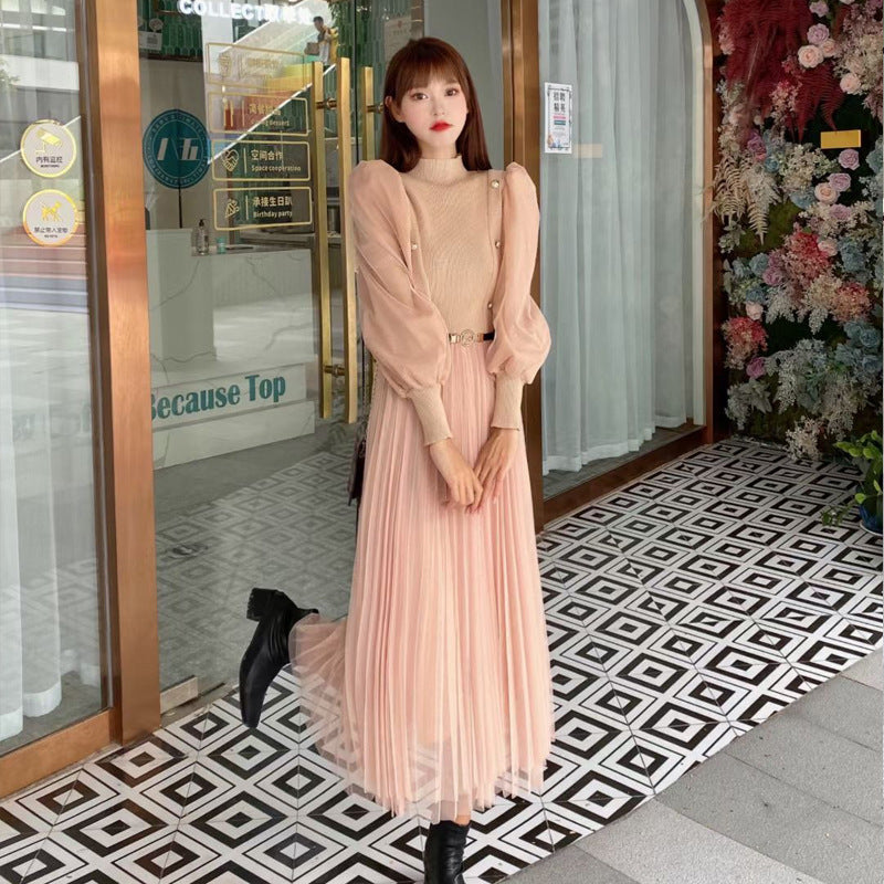 Good quality Elegant Knitted Mesh French Style Long skirt High Waist Dress