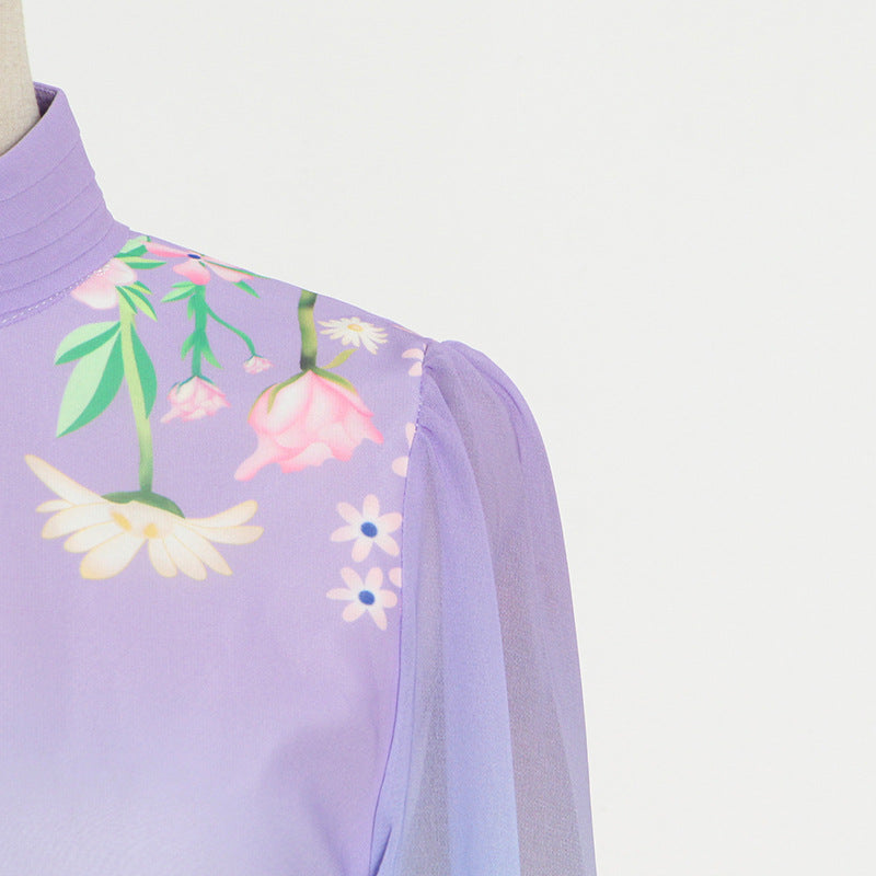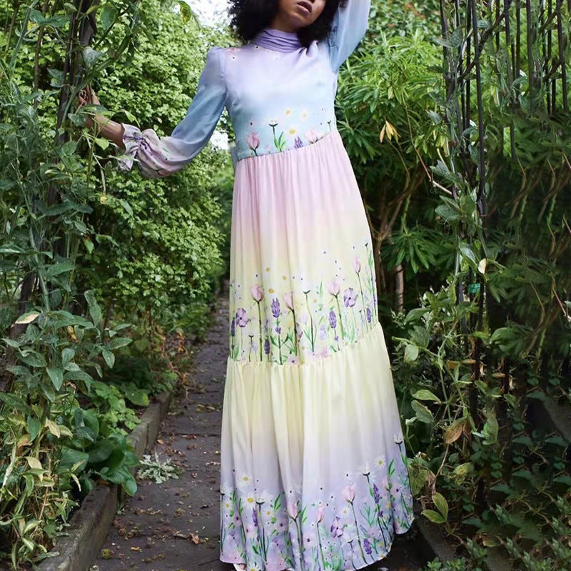 Gorgeous Charm Summer Women Gradient Color Colorful Long Half Turtleneck Chiffon Floral Printed Stitching Large Maxi Dress