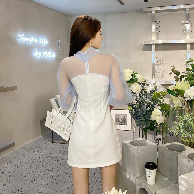 Great Look Spring Office Fashion Temperament Neck Bow Long Sleeved High Waist Mini Dress