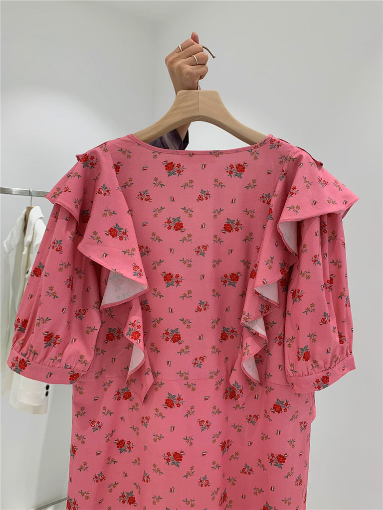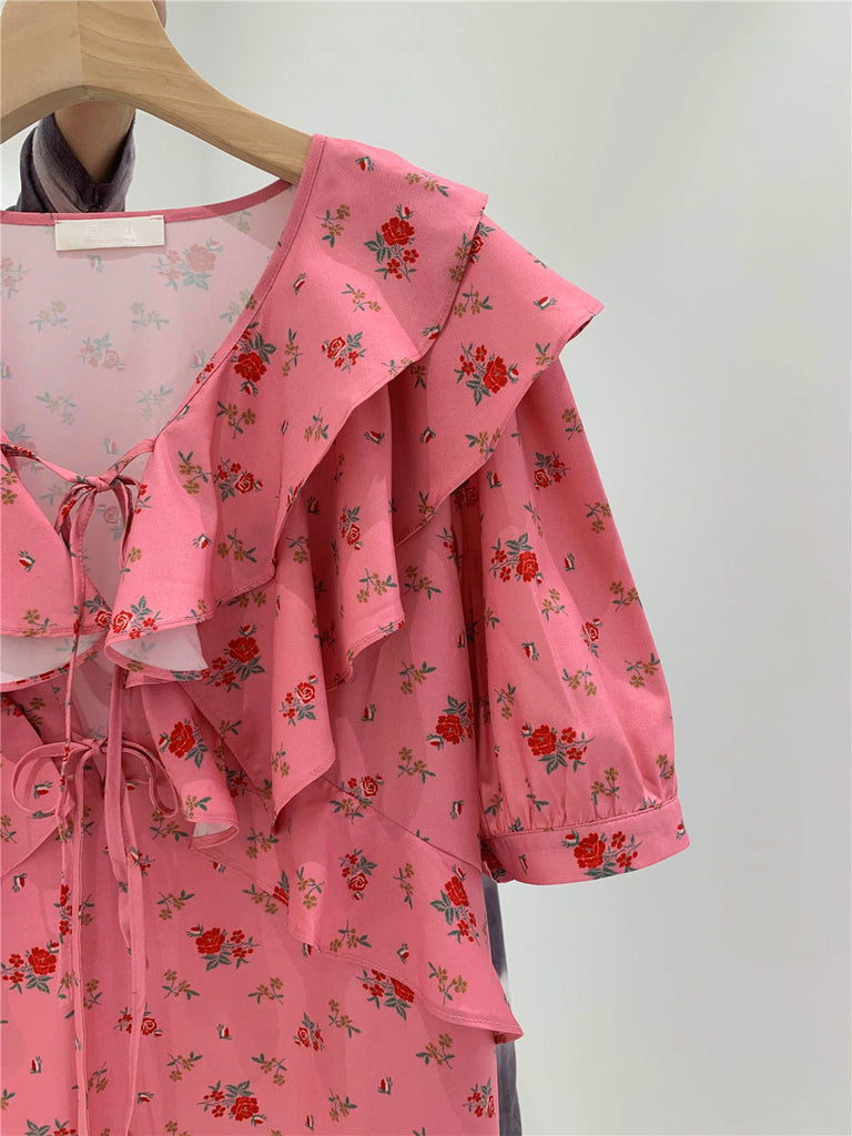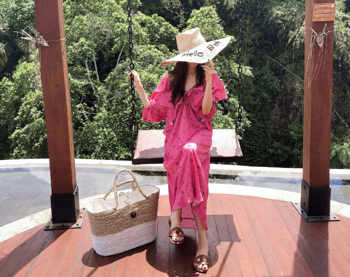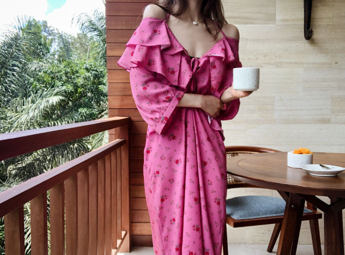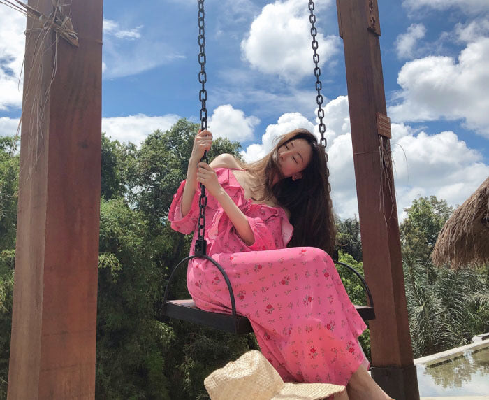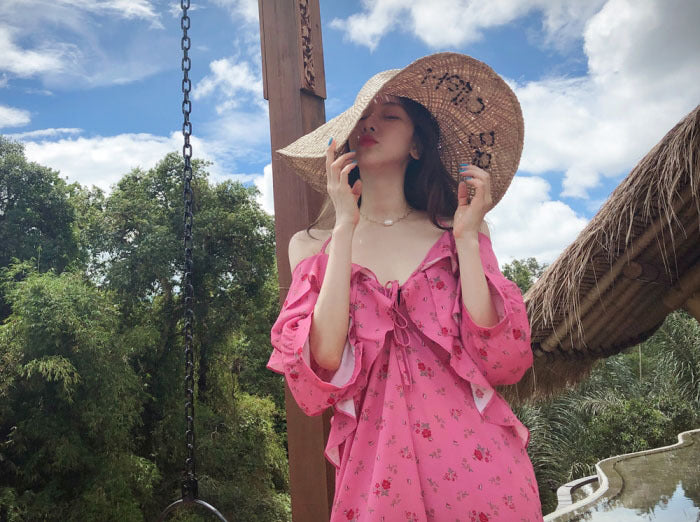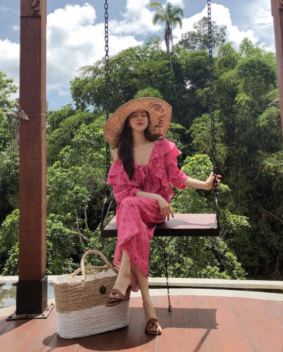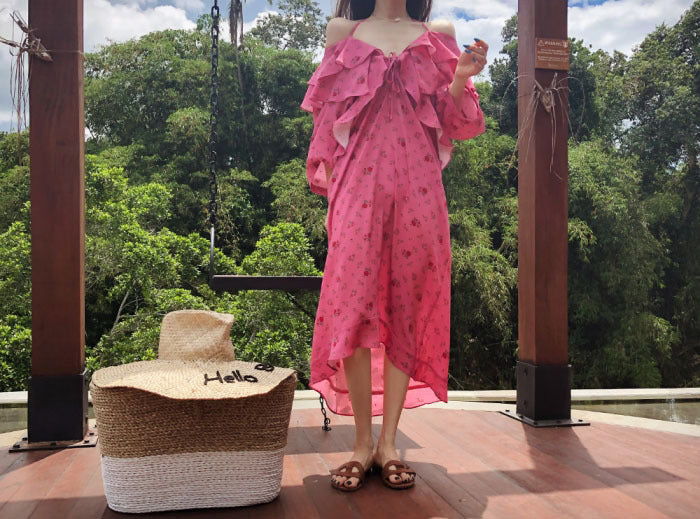 Holiday Chic Women Lotus Leaf Collar Off Shoulder Short Sleeved Floral Printed Bow Spaghetti Strap Dress
