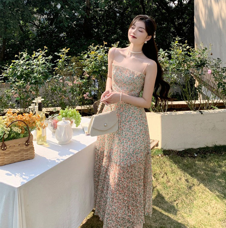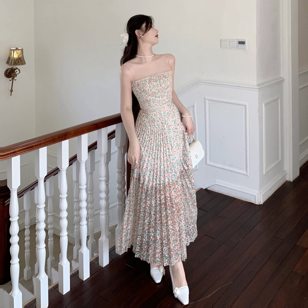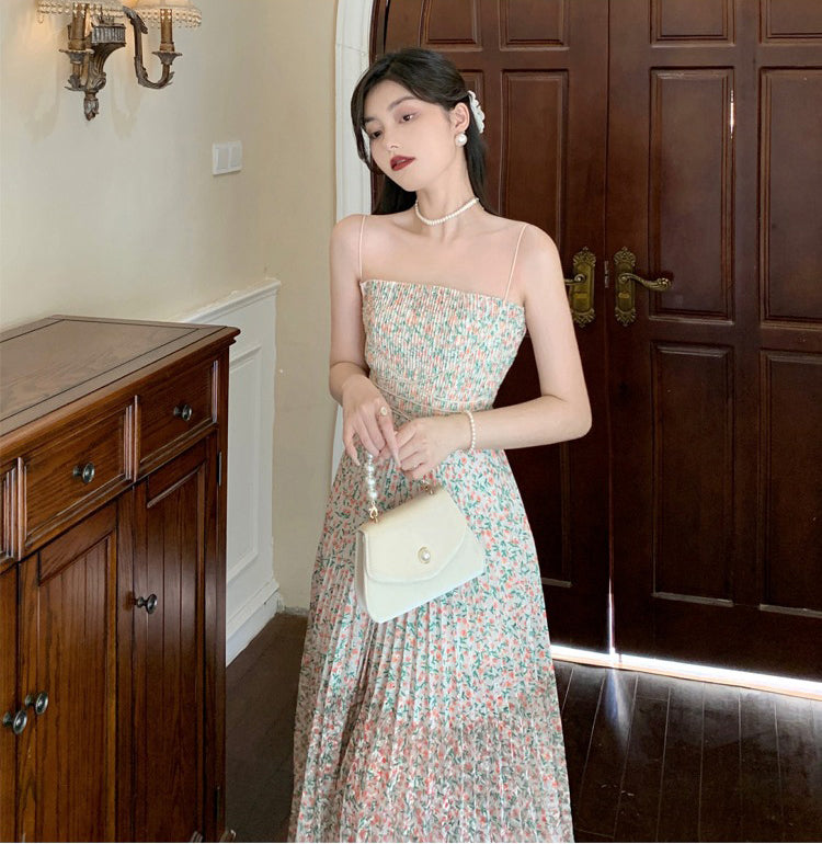Holiday Women Floral Printed Waist Spaghetti Strap Long Pleated Dress