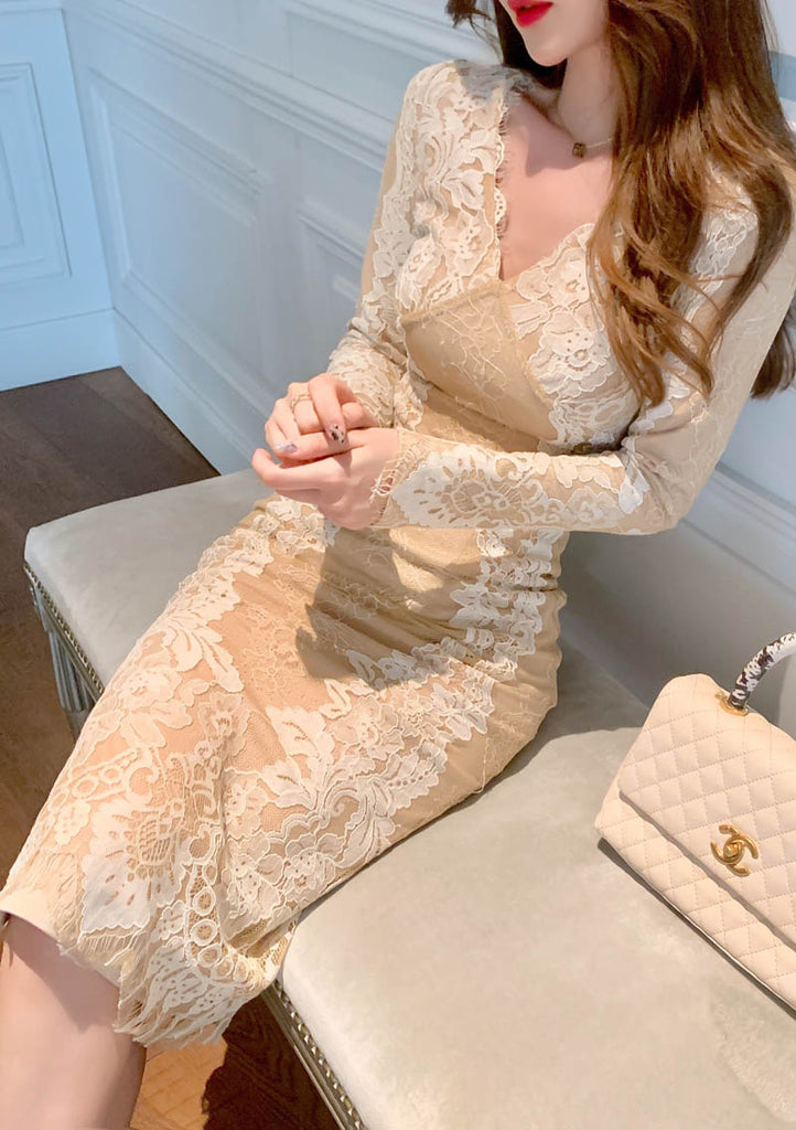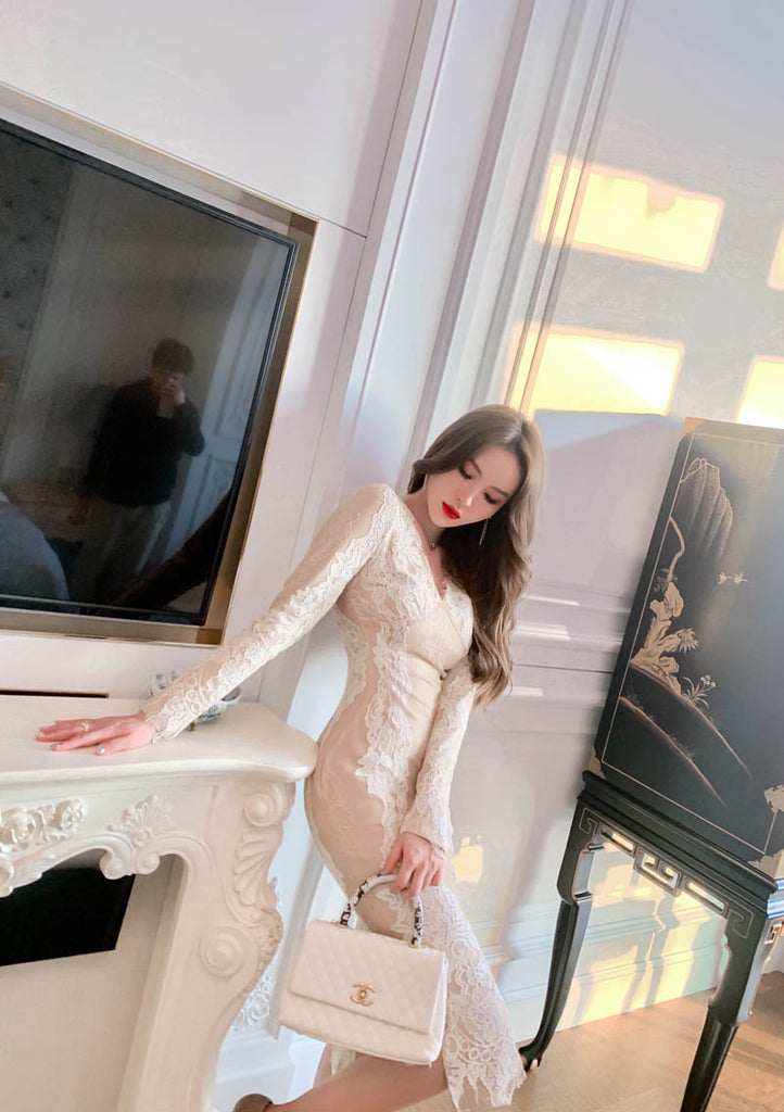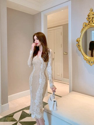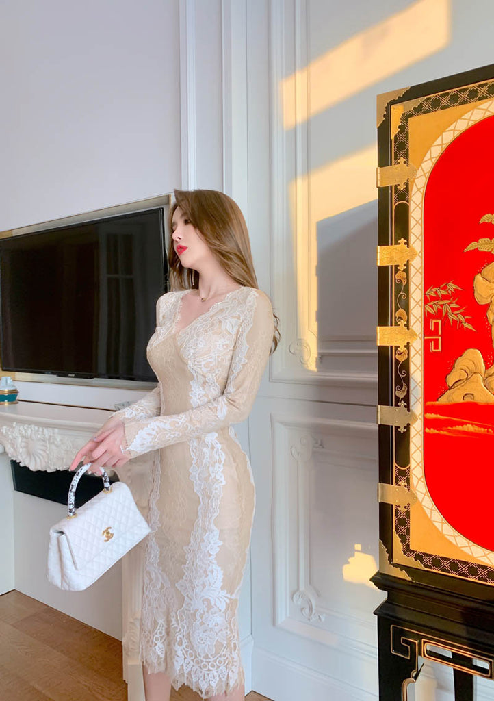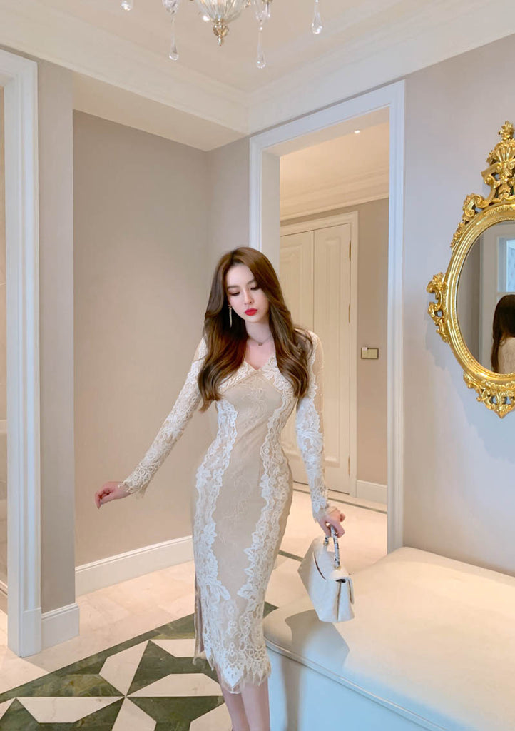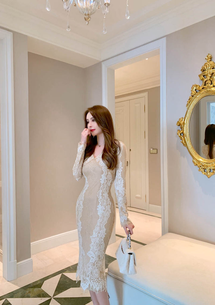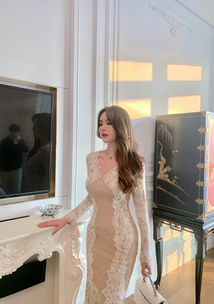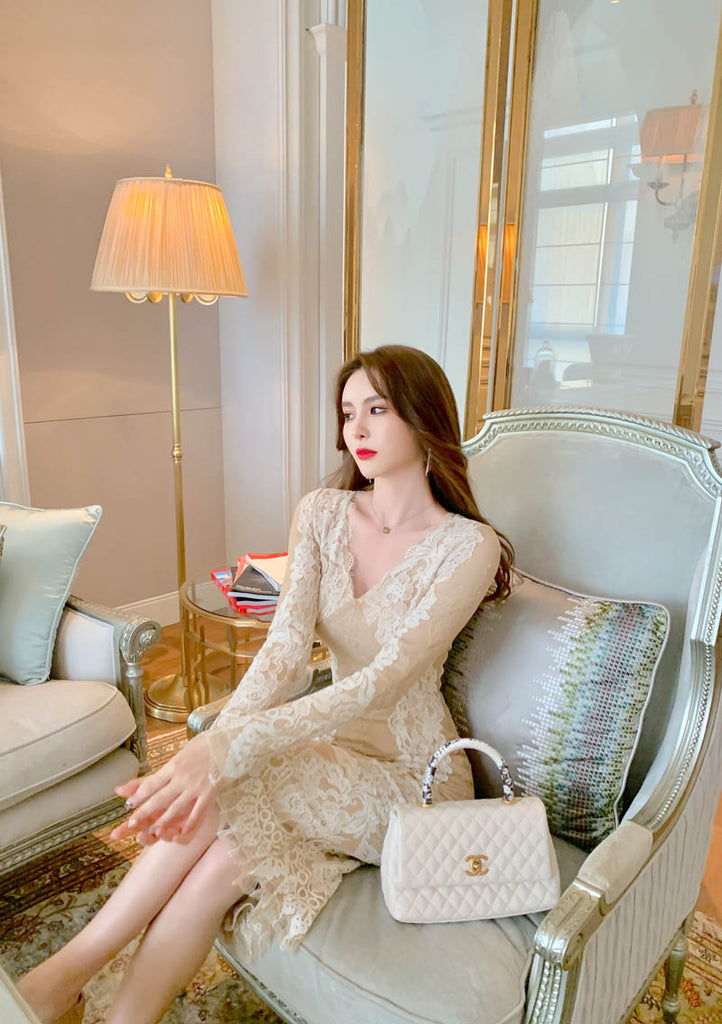 Lace Retro Temperament Floral Printed Fairy Waist Long Skirt V Neck Dress