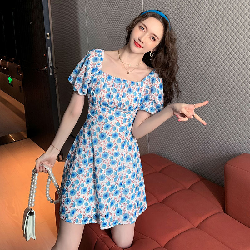 Look Great Summer Pretty Women Square Neck Short Sleeved Printed Chiffon Floral Printed Fairy High Waist Dress