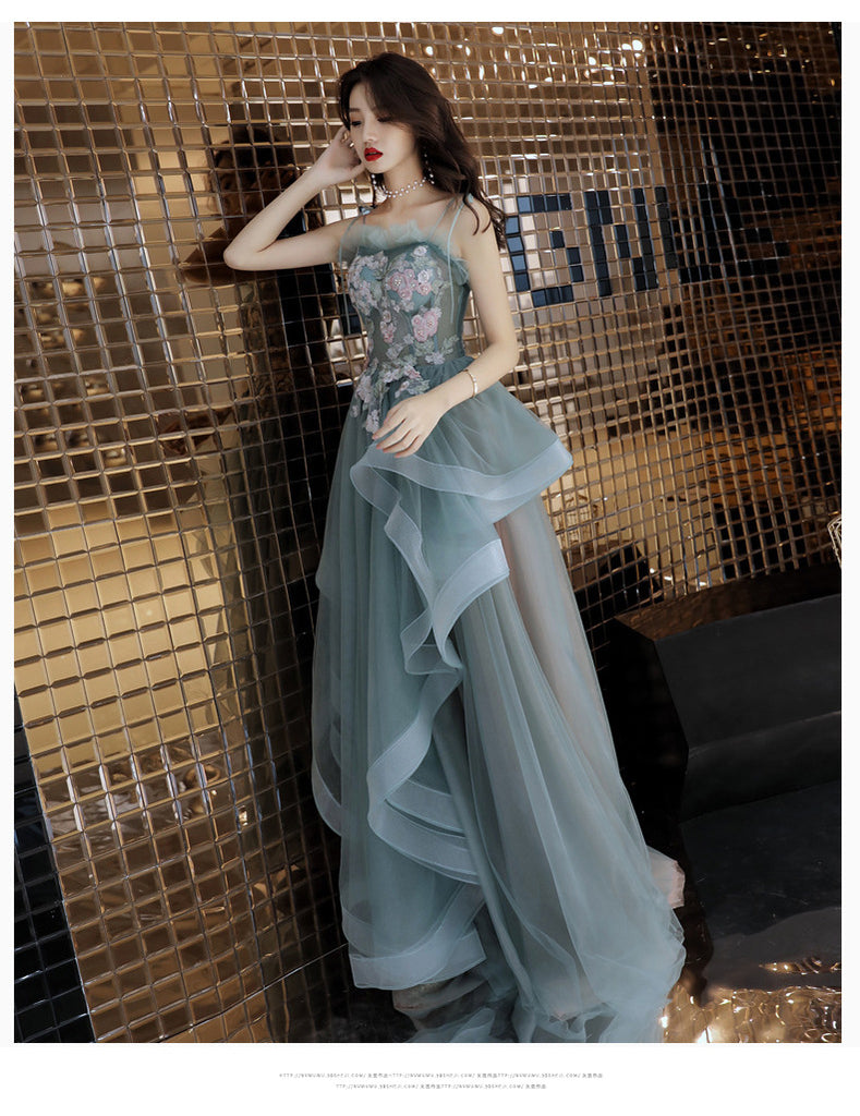 Luxury Attractive Women Modern Jade Green Spaghetti Straps Floral Pattern Irregular Pleated Evening Long Prom Dress