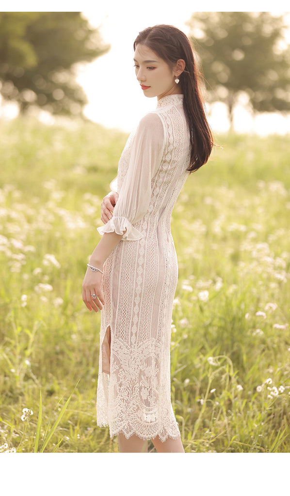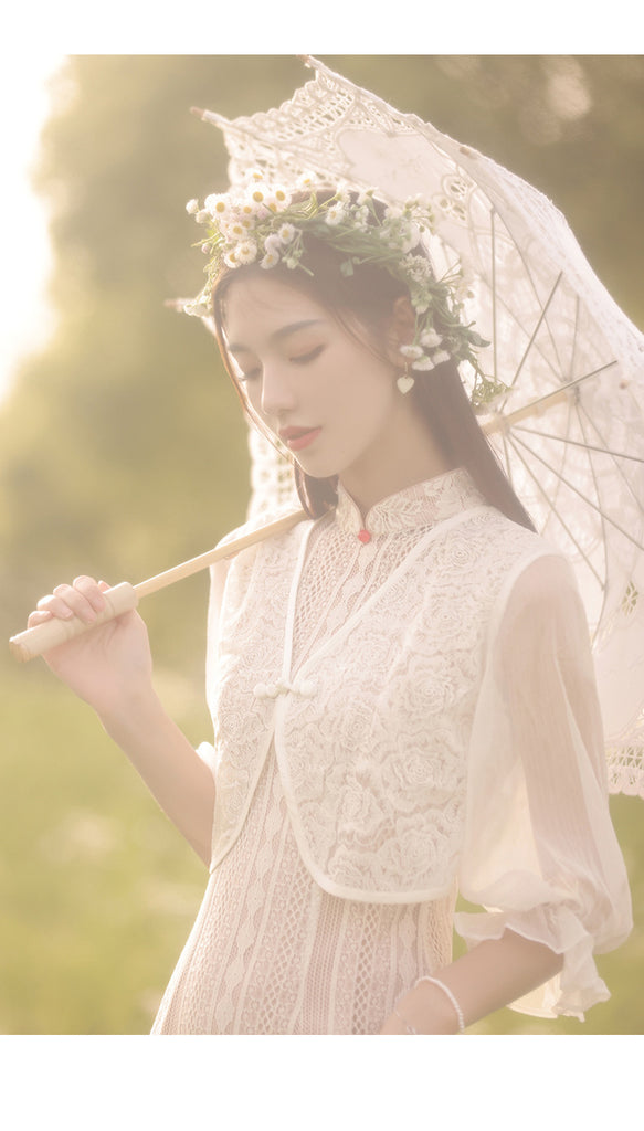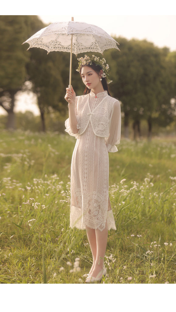 New Summer Young Women Elegant Lace Shawl Two Piece Mid Length Cheongsam Dress