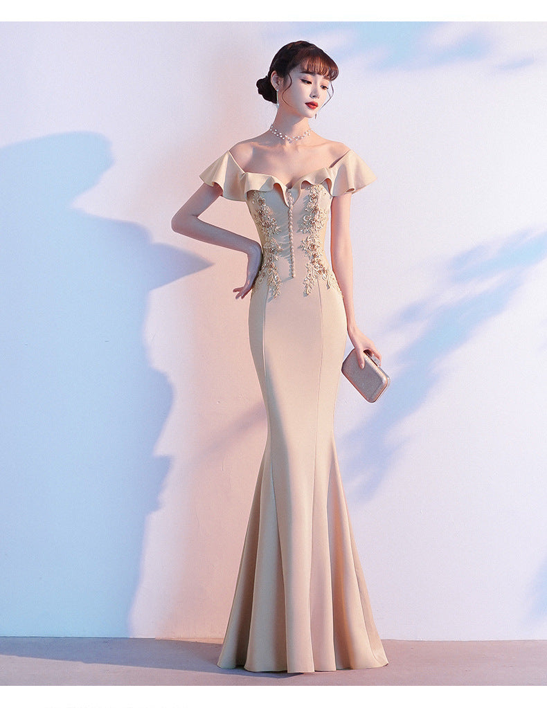 Perfect Look Beautiful Evening Banquet Temperament Sexy Solid Color Off Shoulder Fishtail Long Dress