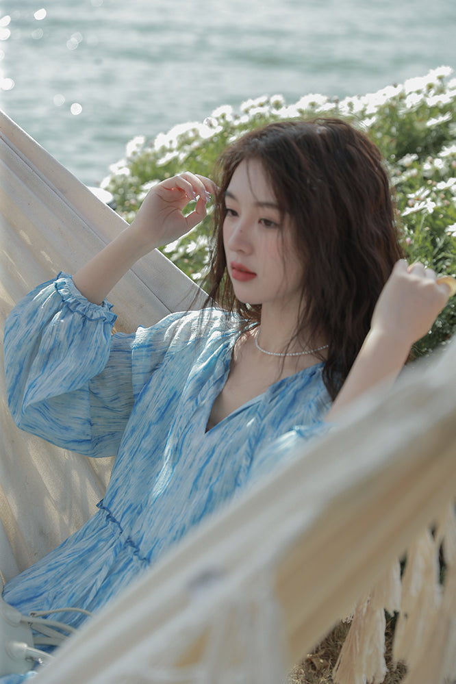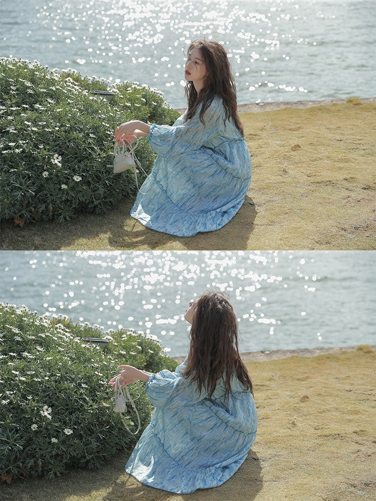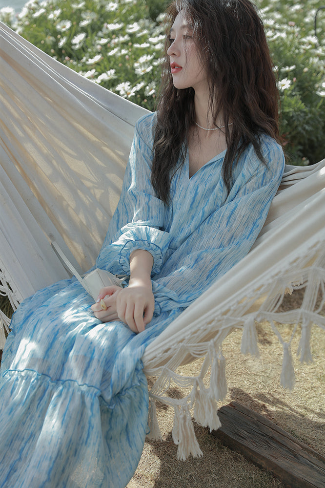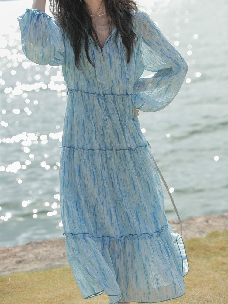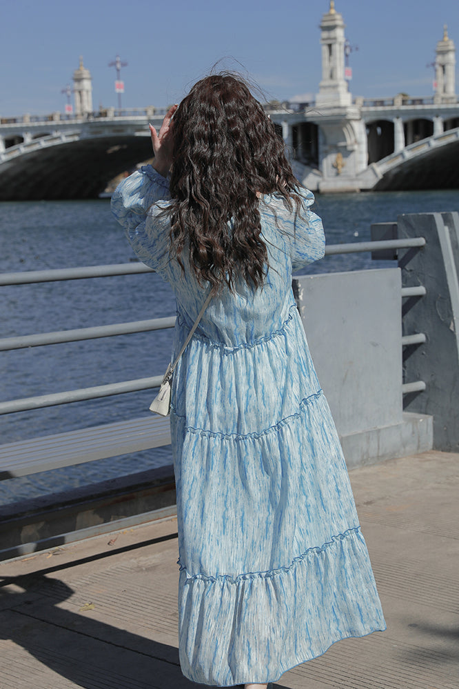 Retro High Quality Temperament V-neck Ink Pattern Floral Long Cake Dress
