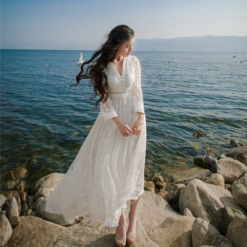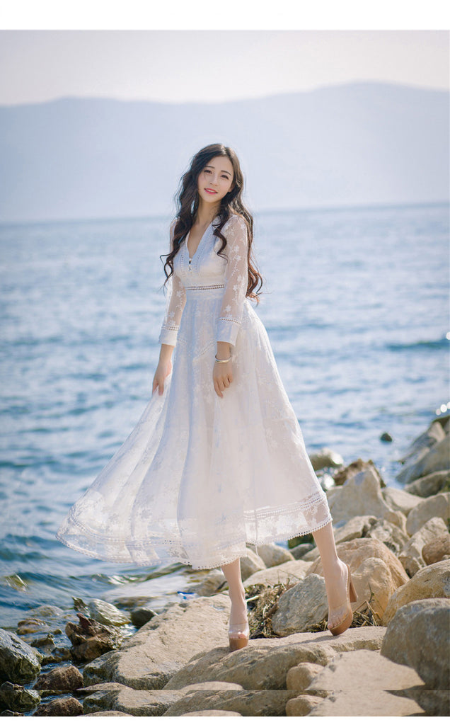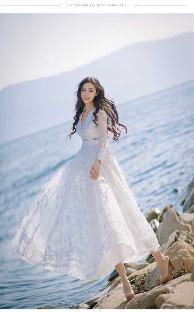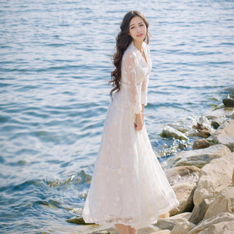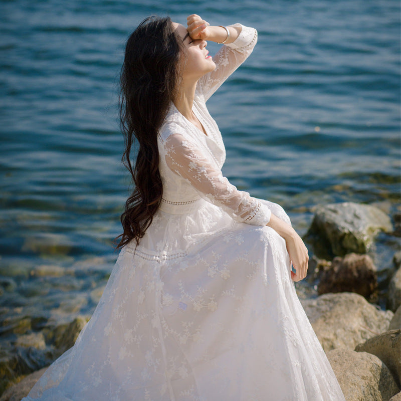 Retro Long Fairy V-neck Sexy Hollow Mesh Embroidery Large Swing White Dress