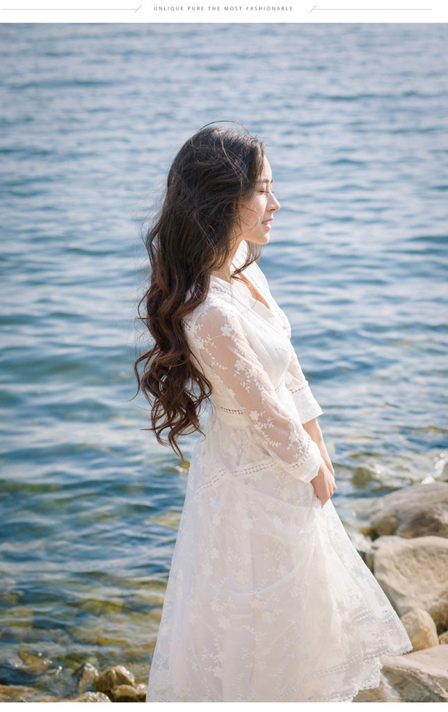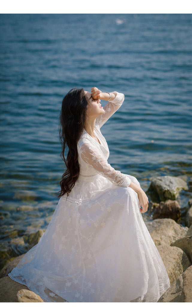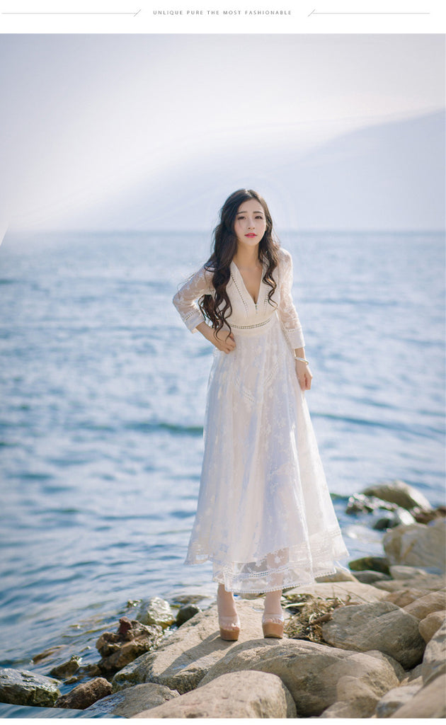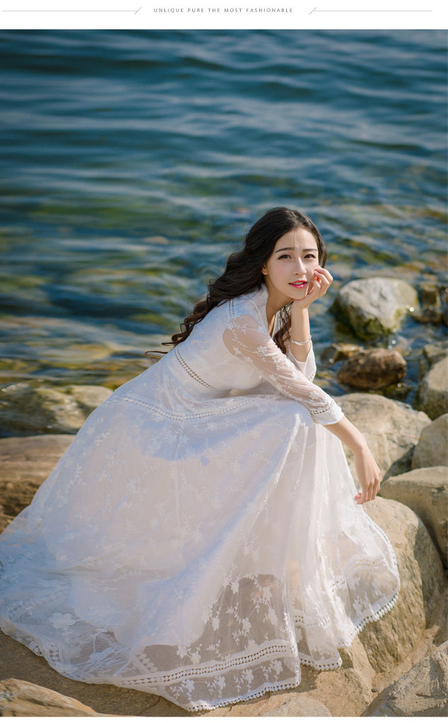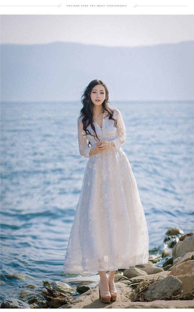 Retro Long Fairy V-neck Sexy Hollow Mesh Embroidery Large Swing White Dress