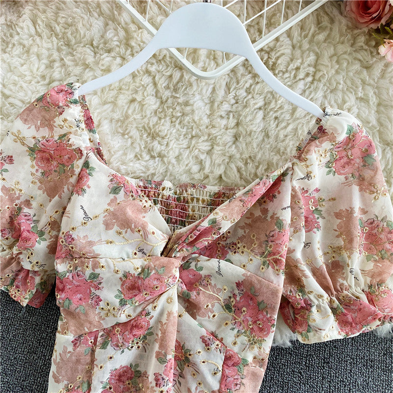Retro Sexy Vintage Floral Chiffon V-neck Front Twist Knot Puff Short Sleeves Ruffle Hem Crop Tank Top Blouses